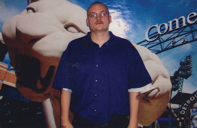 Despite these imposed limitations, the hand-painted backdrops seem to represent fantasies more than any one place in particular. They oddly parallel the cheesy and gimmicky props found in a Kmart photo studio, props that help children, couples and families appear more perfect, happy and normal than they most likely are. The backdrops, and the inmates framed within them, feel aspirational and hopeful, with the perfect family being replaced by the perfect landscape or location. The all-encompassing need for these particular fantasies, for these kind of locations — the perfect sunset, ocean view or grove of maple trees — is certainly understandable, and dominates the photographs; though trapped inside a dismal reality, the “click clicks” project pure escapism.