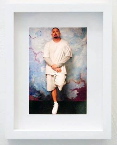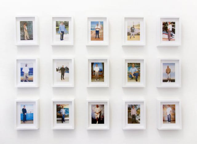 Moving beyond the installation as whole, we realize that “click clicks” actually are snapshots, printed on that familiar pearl paper so different from digital prints. Despite the reality that we are staring into the faces of inmates, these prisoners look vaguely familiar, like seeing a photograph of the cousin you met once a long time ago but haven’t seen since. All men, they are dressed in causal everyday clothes, posing with wistful and almost apologetic smiles. They remind us of no one and everyone at the same time, as they look like the people you’d run into anywhere that middle class Americans go — the supermarket, the gym, in a public park. The pictured prisoners seem to defy stereotypes simply by looking like themselves, and Adler’s presentation of them changes how we think about staged and manipulated studio portraits.