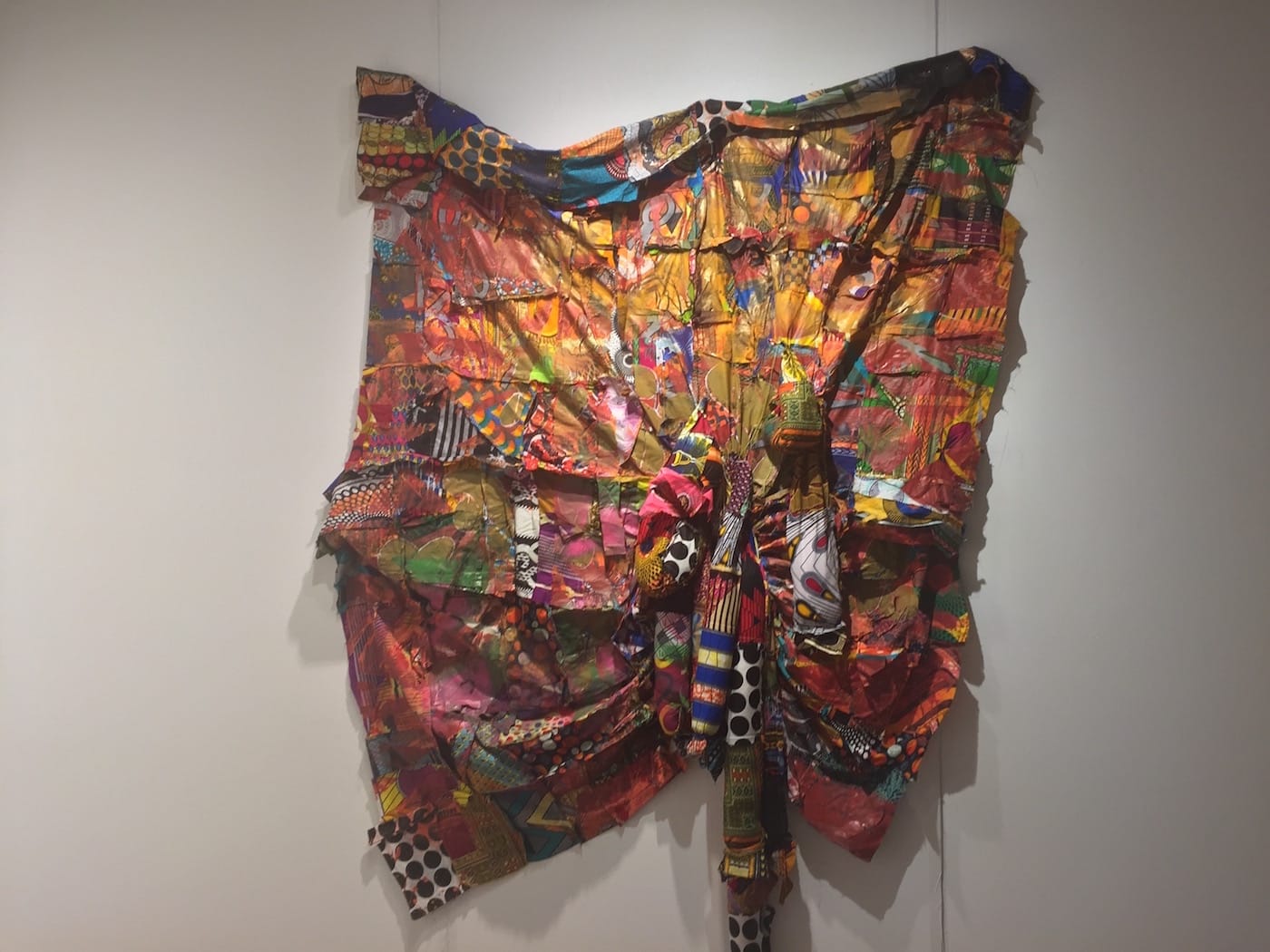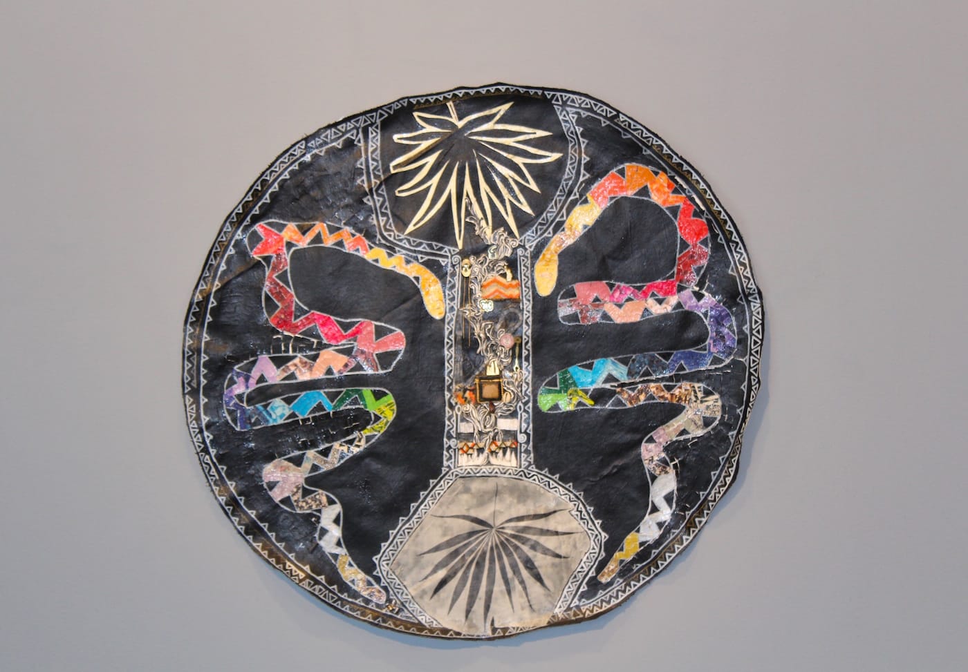 The work at Prizm also channels the spirit of embodiment — the literal, manifested act of being fully inside one’s body. Presence, people call it. Reimagining the self is some form of transformation as well; it’s everywhere at Prizm: Osi Audu’s graphite self-portraits that look like voids, their sheen a suggestion of what’s inside. Amber Robles-Gordon’s works that look like mandalas, decorated with her belongings — cowrie shells, jewels — and entrail-like snakes. Adriana Farmiga’s watercolor acrylic nails, painted rainbow-pastel. Jamele Wright’s big, gorgeous tapestries of fabric, repeated patterns — a reference to the mingling of identities, recycling, even in hip-hop — and red dirt from the earth.