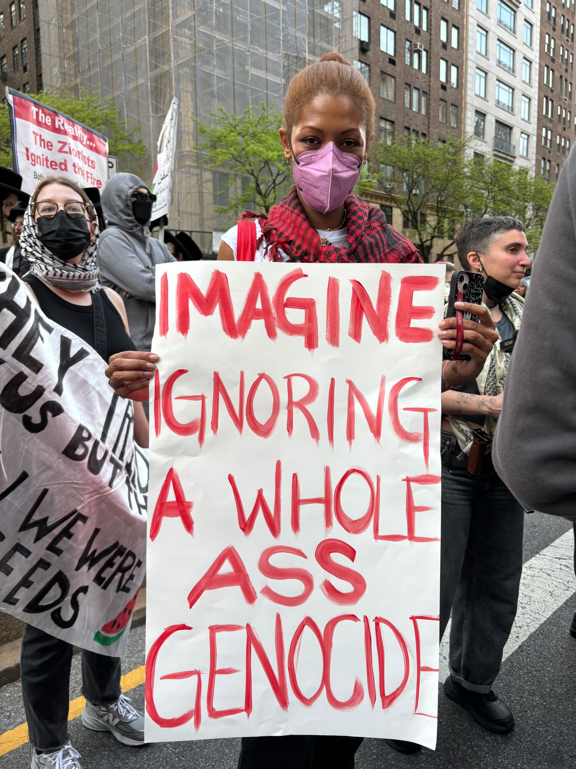 “It’s amoral,” Johnson said. “I’m here in solidarity with Gaza because there’s no business as usual while that’s happening.” She raised a hand-painted sign that read, “Imagine ignoring a whole ass genocide.”