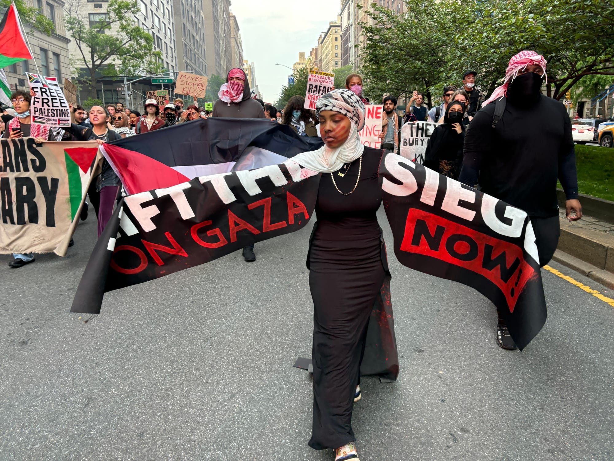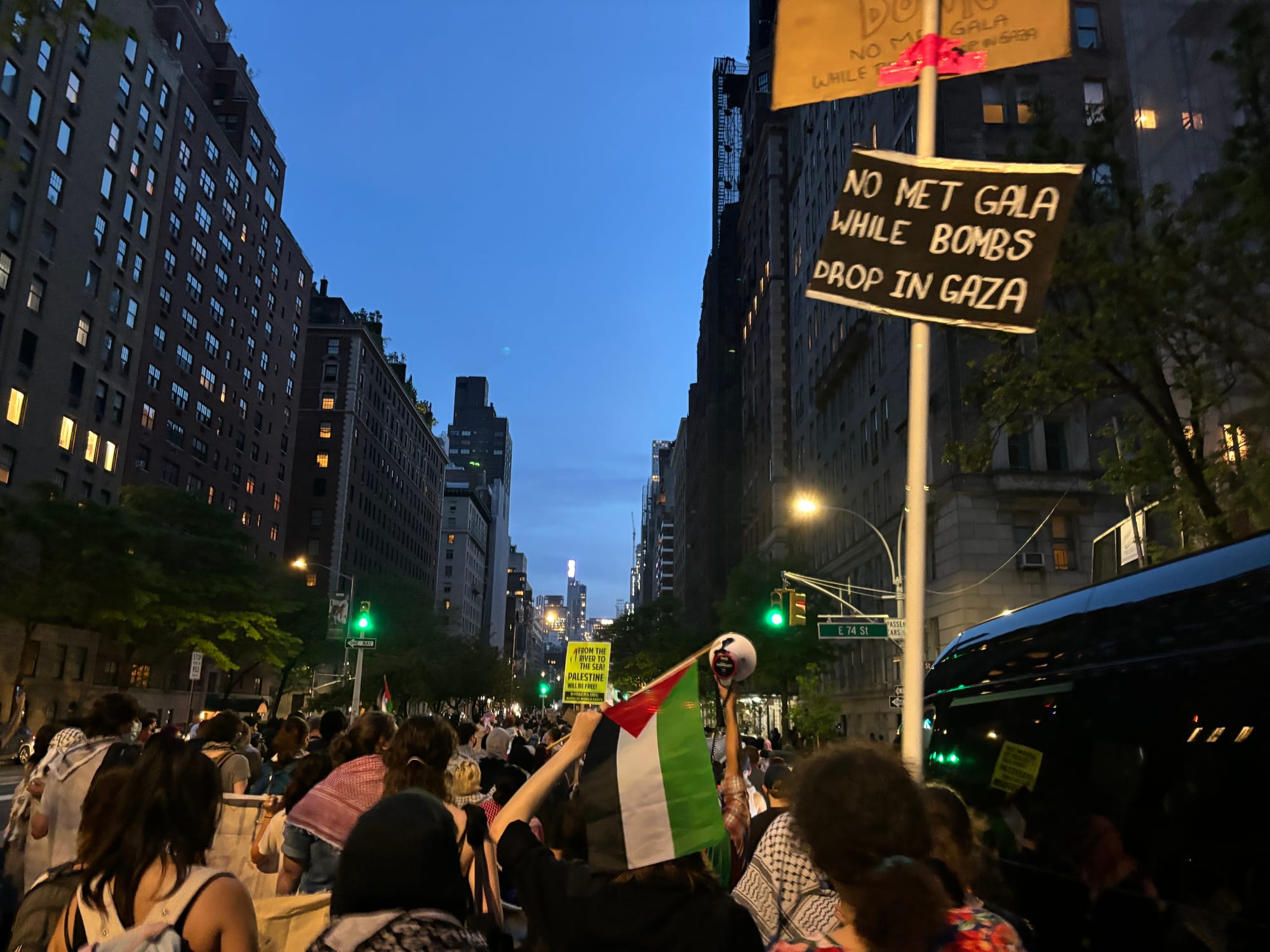 “No Met Gala while bombs drop in Gaza,” hundreds chanted during a march near the museum.