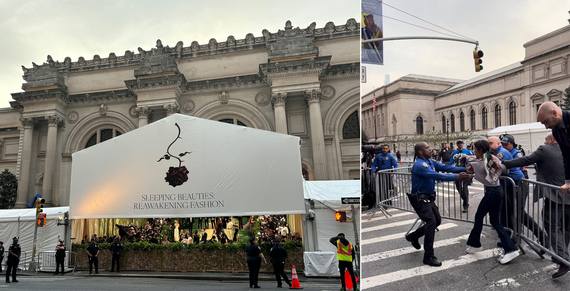 Left: The red carpet entrance to the Met Gala; right: Protesters attempting to breach barricades outside the museum (photo used with permission)