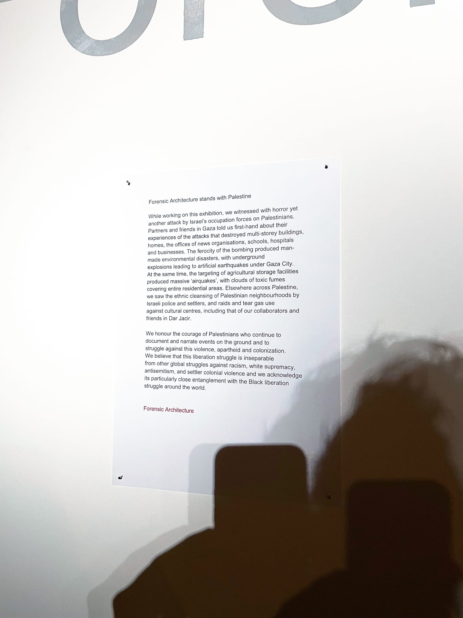 After learning that its statement had been removed from the exhibition, Forensic Architecture requested that its works be withdrawn from the exhibition.