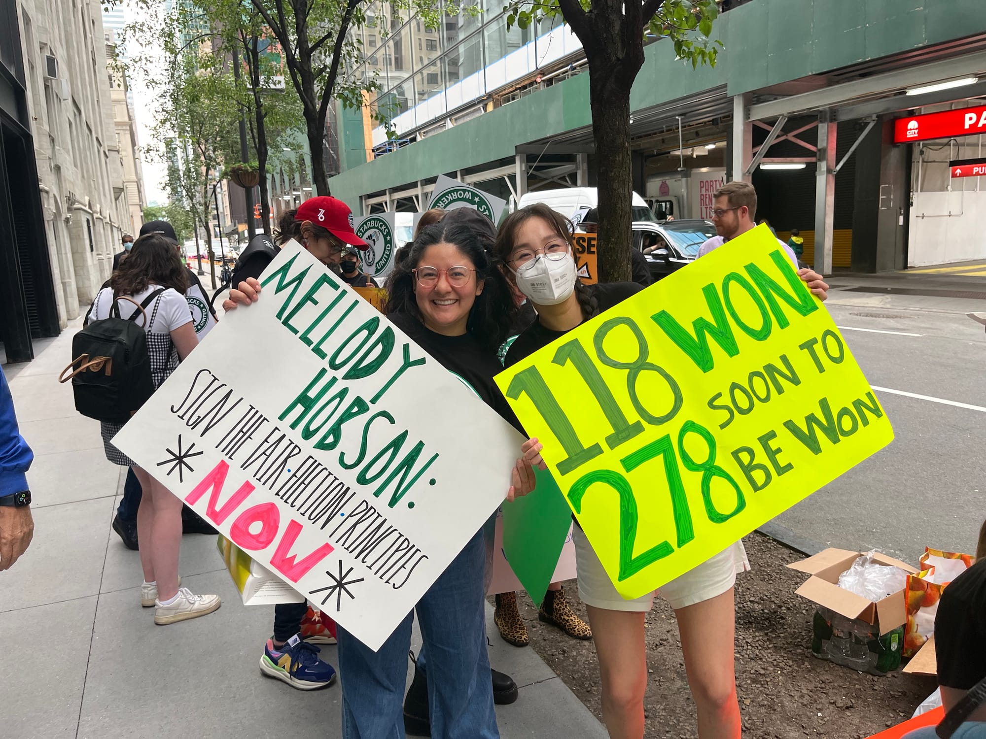 Employees at Starbucks locations across the country have continued to enter into the union. Hours before the MoMA protest, the Memphis store where seven employees were fired officially joined Workers United.