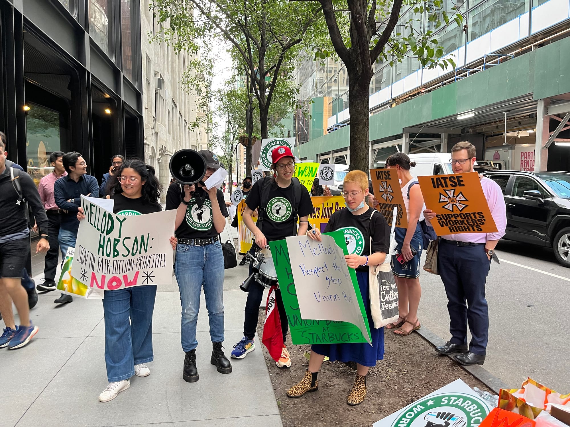 The action was organized by Workers United, the umbrella union of the growing Starbucks Workers United. There were four Starbucks workers in attendance; the majority of the protesters were Workers United staffers and members of other unions, such as the International Alliance of Theatrical Stage Employees.
