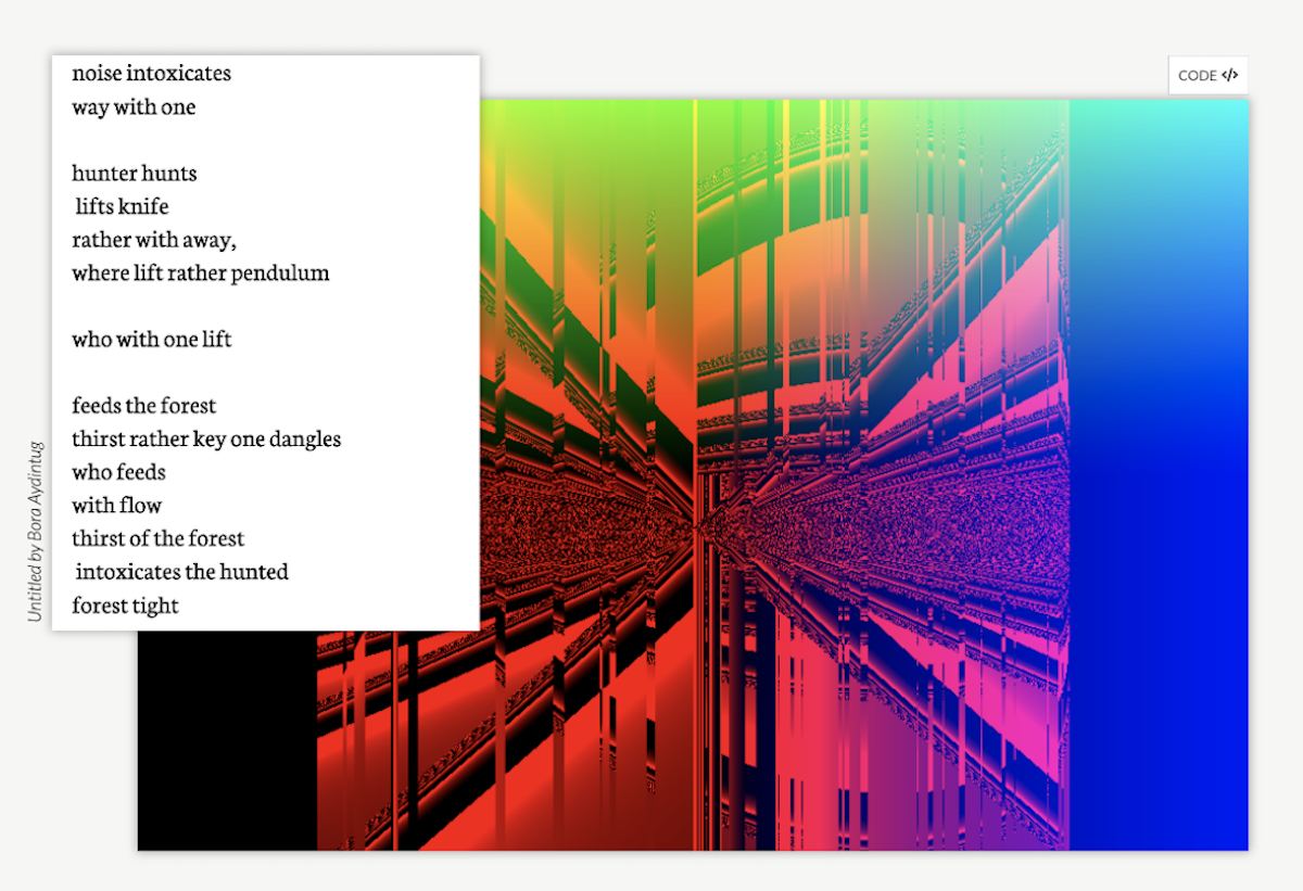 Where Piet's code is made up of images, in:verse programs generate images or moving content. Its code doubles as poetry. What is unique in in:verse is its variable lexicon: the mapping of vocabulary to command is different for each poem (via a “wordtable”), allowing programmer-poets to finely tune their input and output. To calculate the sine of a number, one program might use the word “alien,” while another uses “mushrooms.” The most interesting in:verse programs find a resonance between their vocabulary and their visual output. Its creator, Sukanya Aneja, is an engineer and artist who built on some traditions of esolanging (in:verse’s stack-based architecture is similar to many early esolangs) while refining it for artistic purposes. Like Piet, it allows individual programmers a lot of control, but each piece is still recognizable as an in:verse work.