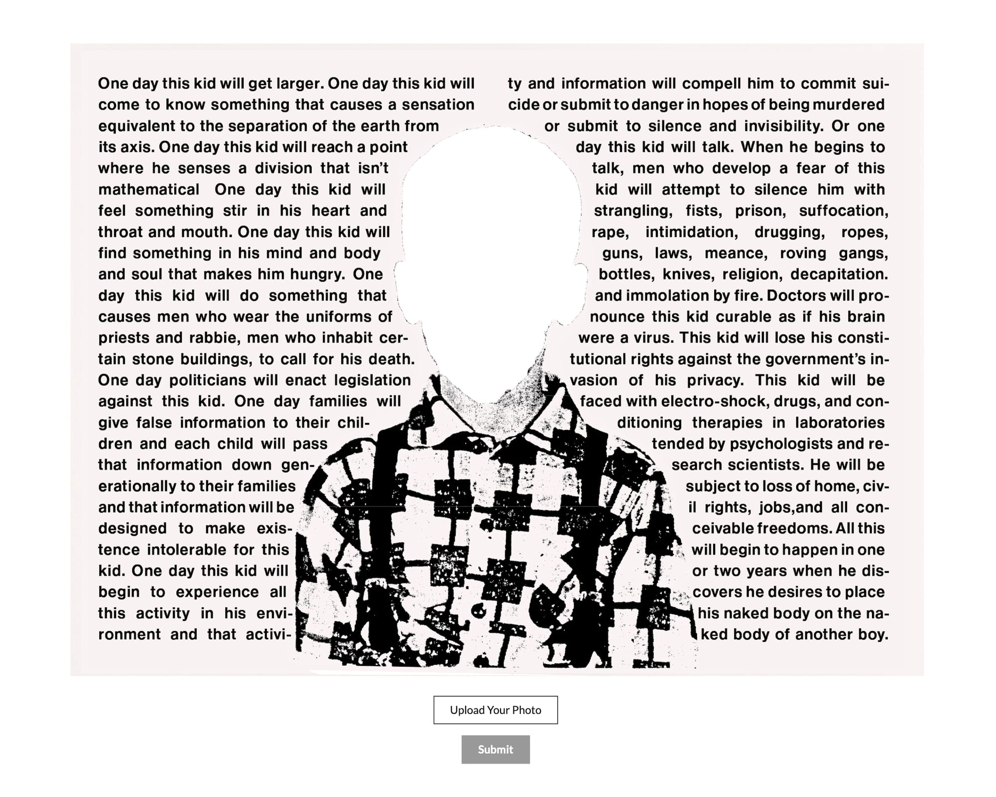 In commemoration of the 30th anniversary of Wojnarowicz's death on July 22, 1992, a website called "One Day This Kid" allows people to upload their own portraits in place of the artist's, offering a chilling reflection on the hatred and violence that queer people still face in 2022. The site was launched by PPOW Gallery — which began exhibiting Wojnarowicz's work in the 1980s and now represents his estate — as the first project of the newly established David Wojnarowicz Foundation.