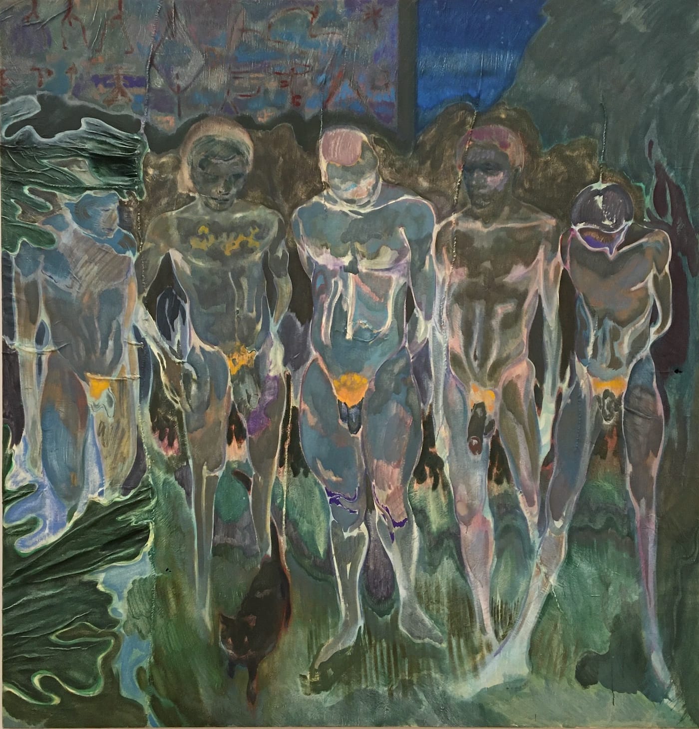 The formal and thematic elements of Armitage’s work, as much as his artistic education, align it with the more narrative branches of the School of London, namely the paintings of R. B. Kitaj, with a smidgen of Francis Bacon and David Hockney thrown in (if those two diametrically opposed figures can cohabit a single artist’s imagination). The exhibition’s introductory wall text states that, along with the European avant-garde, Armitage has been influenced by the Kenyan artists Meek Gichugu and Chelenge, and the Ugandan Jak Katarikawe.