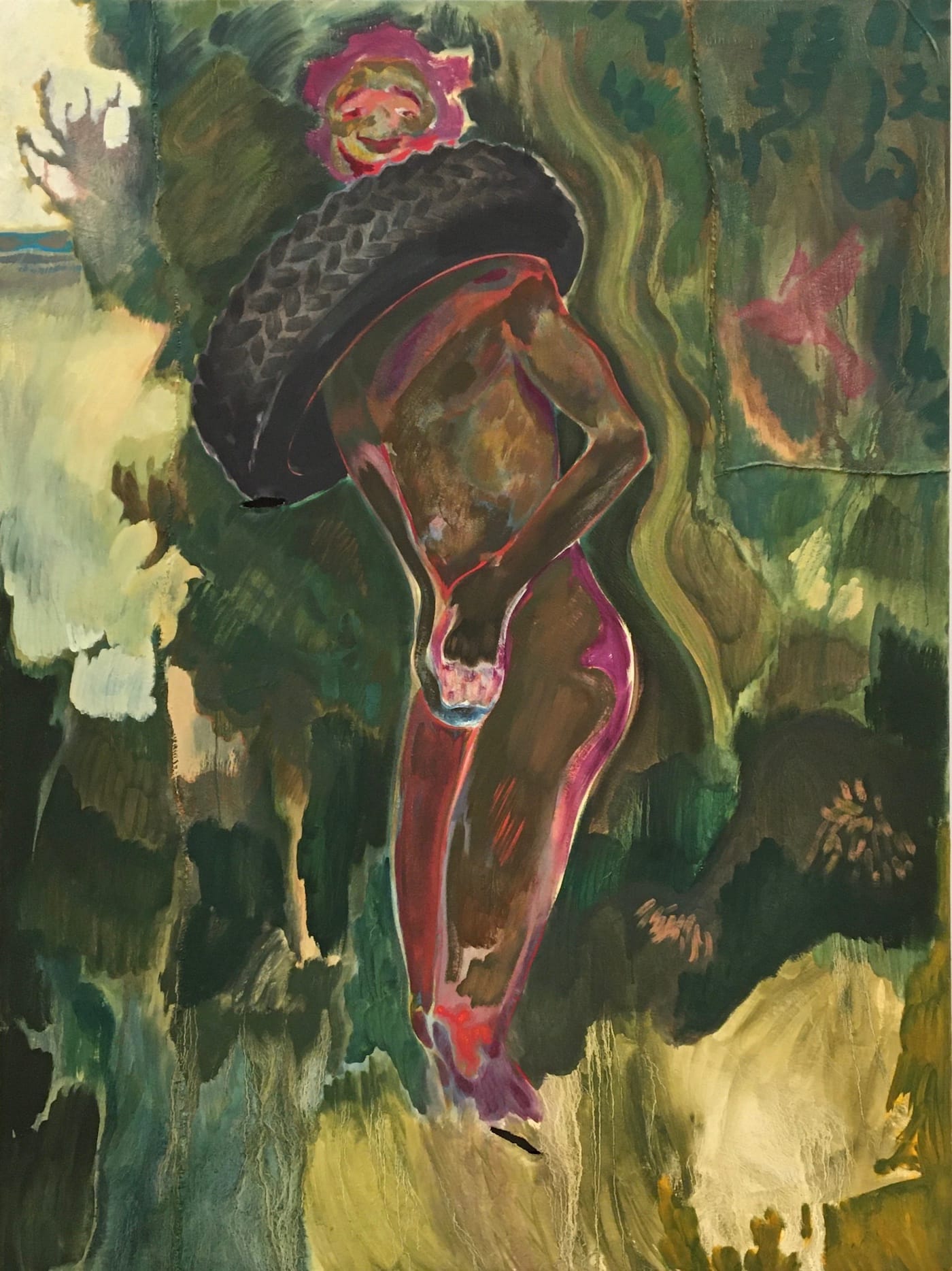 Armitage’s imagery quickly takes a turn to the horrific in “Necklacing” (2016), a painting of a male nude with a car tire wrapped around his neck, invoking the torture/executions perpetrated by some Black South Africans against informants and collaborators in their midst, despite the African National Congress’s condemnation of the practice.