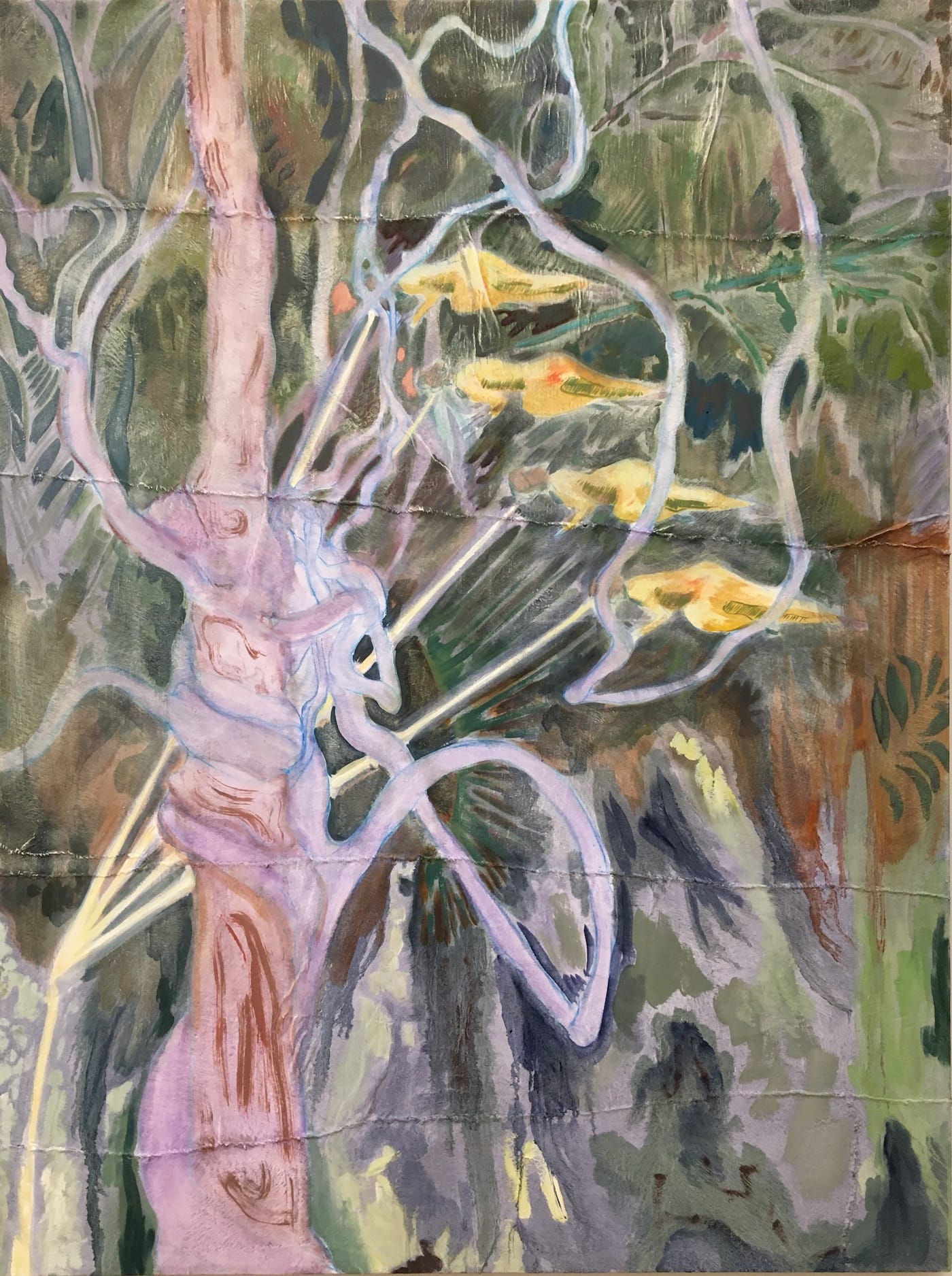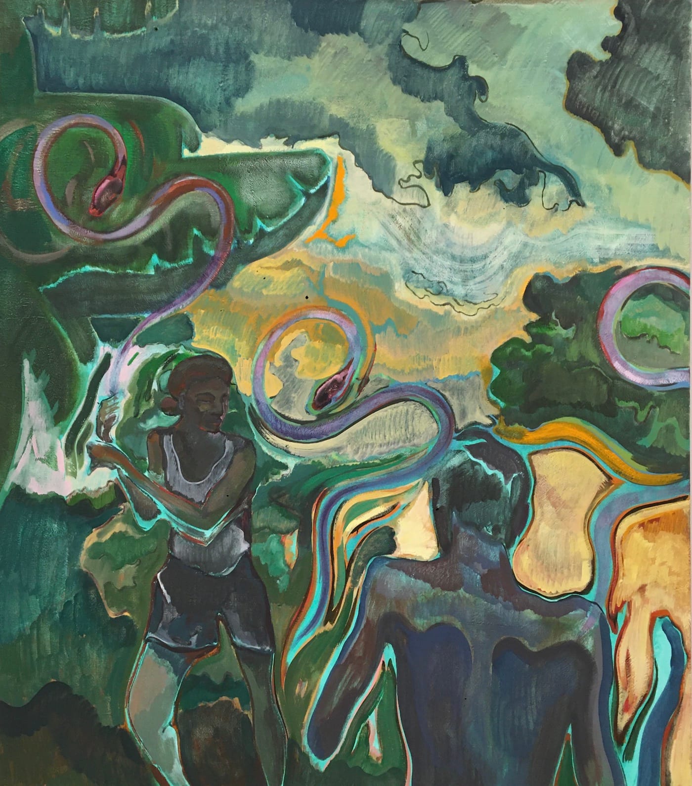 The painting in this show that feels the most unencumbered, joyfully so, by the weight of history or current events is “Seraph” (2017), dominated by a pinkish-purple tree trunk encircled by light purple vines, against the variegated greens of the forest. To the right of the tree trunk, hovering amid the vines, are three horizontal bodies rendered in glowing shades of orange and yellow, the seraphim of the title.
