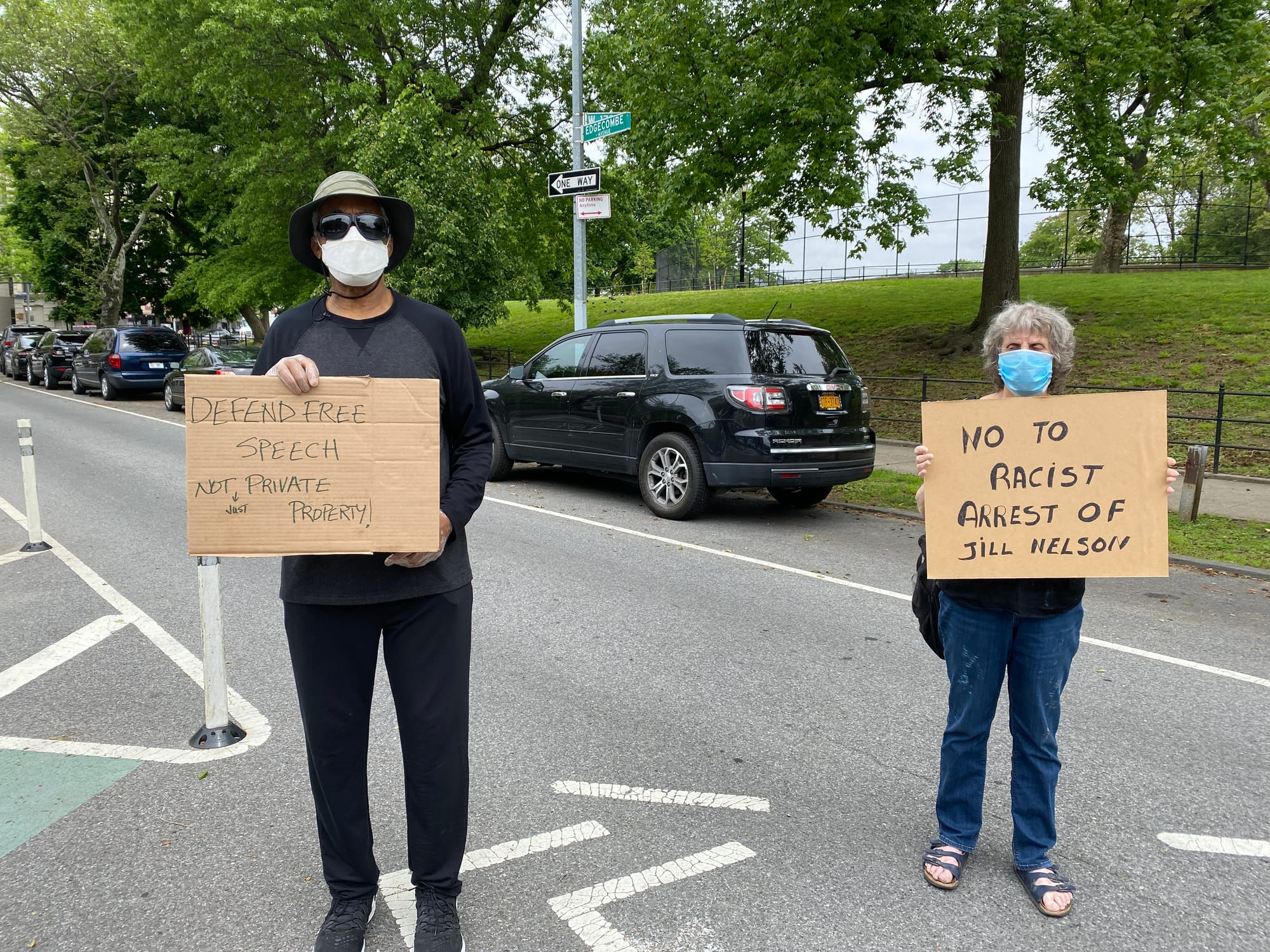 Addressing the crowd of spread-out protesters, Dave Dubnau, a neighbor from Nelson’s building, said, “Not only does the brunt of this terrible epidemic fall heaviest on people of color, on Black and brown people and Native Americans across the whole country, but symbolically, the arrest of Jill Nelson shows that the burden of expressing free speech and opinion falls on a 67-year-old African American grandmother.”