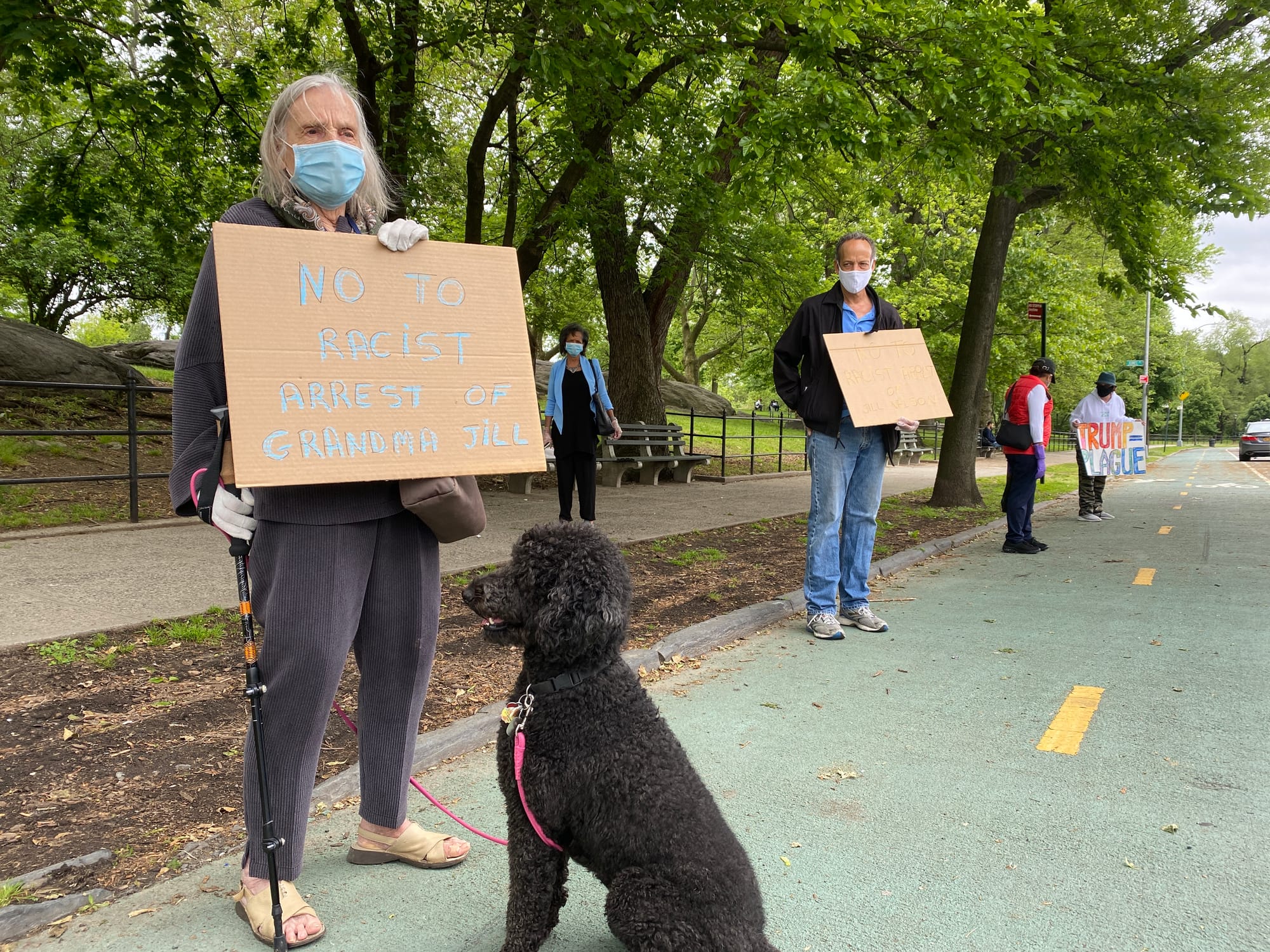 The protesters demand the NYPD expunge Jill Nelson's record and to cancel her summons for a court appearance in August. Last month, she was arrested and detained for hours after writing “Trump=Plague” in washable pink chalk in uptown Manhattan.