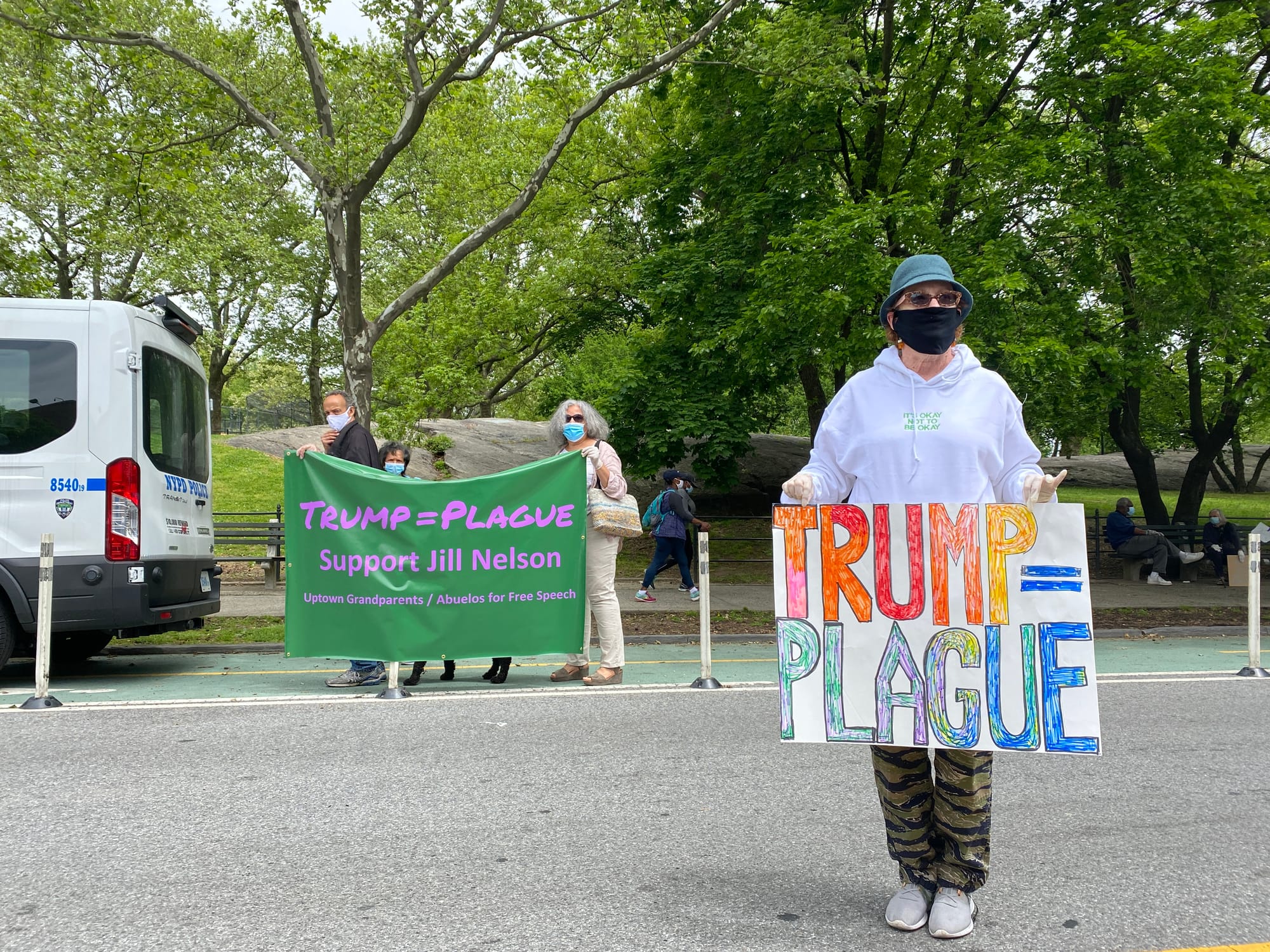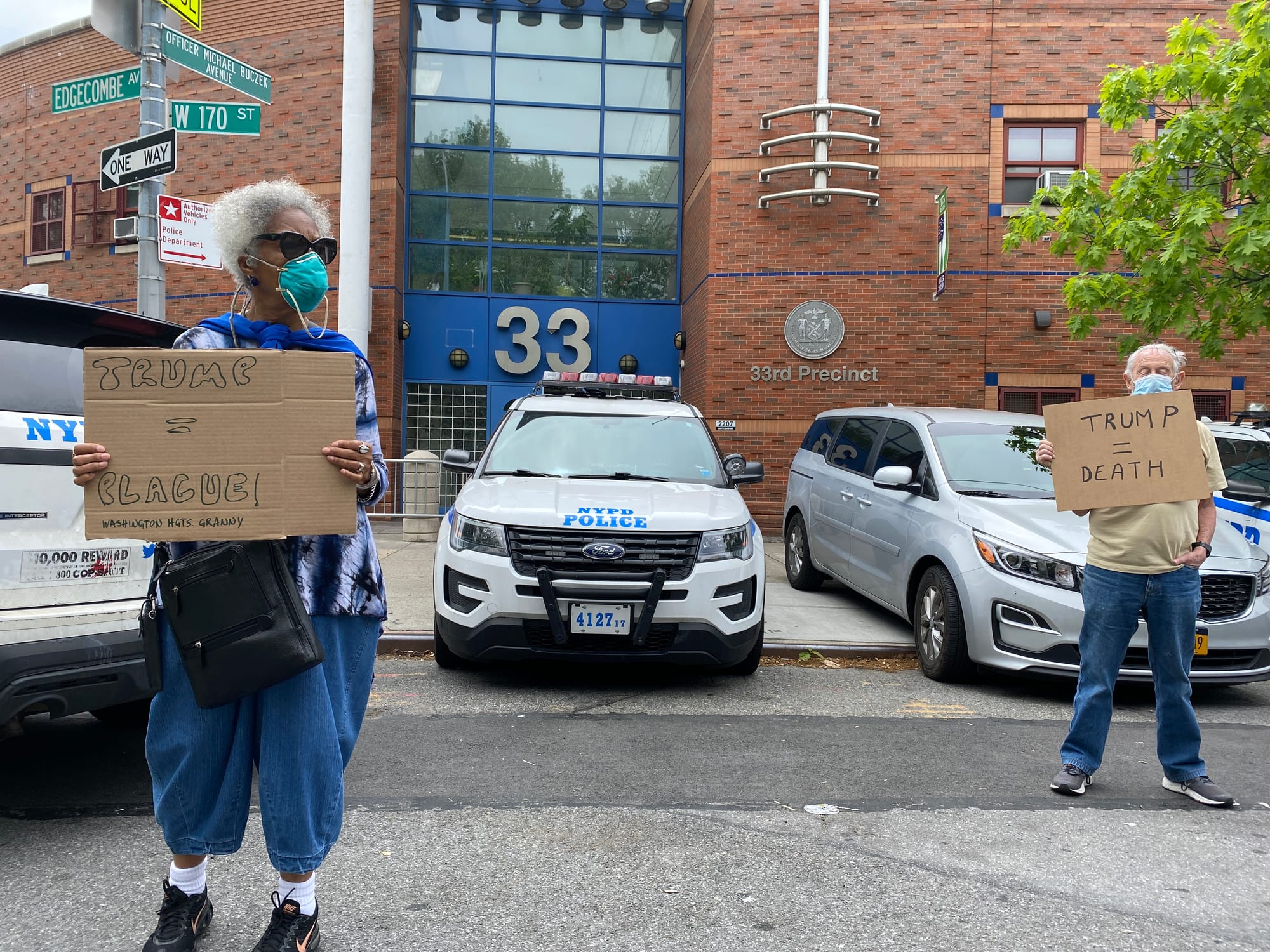 At yesterday’s protest, participants held signs that read “TRUMP=PLAGUE”; “TRUMP=DEATH”; “No to racist arrest of Jill Nelson”; and “33rd! apologize to Jill Nelson,” among others. The action was organized by friends and neighbors of Nelson’s, who is being called “graffiti grandma.” They were joined by New York State Senator Robert Jackson, former New York State Assembly member Keith Wright, and dozens of supporters.