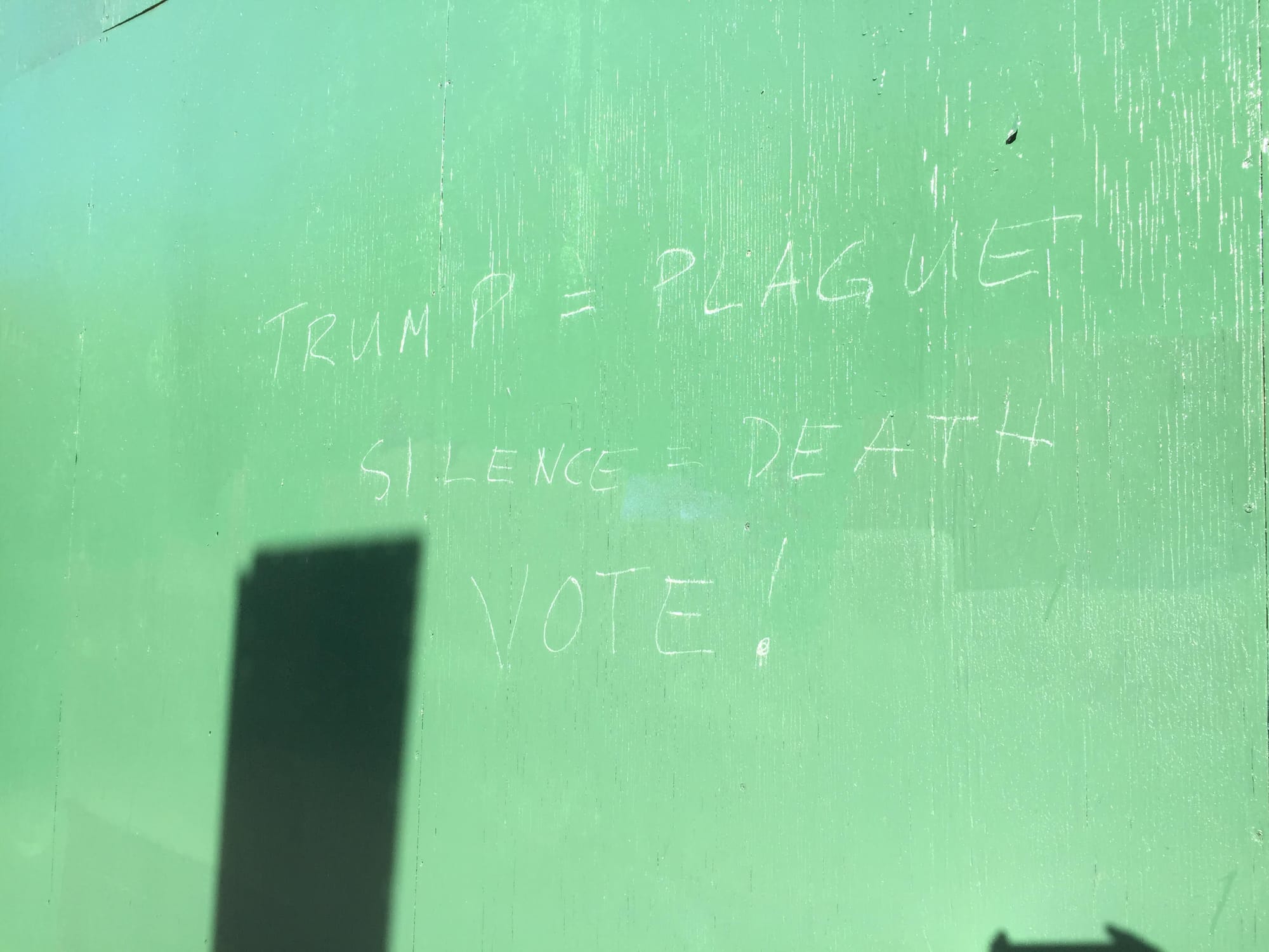 Since the arrest, an anonymous person has recreated Nelson’s “Trump=Plague” graffiti at the same plywood board on 162nd Street, adding “SILENCE=DEATH” (a phrase borrowed from a 1987 poster project to raise awareness of the AIDS crisis) and “VOTE!”