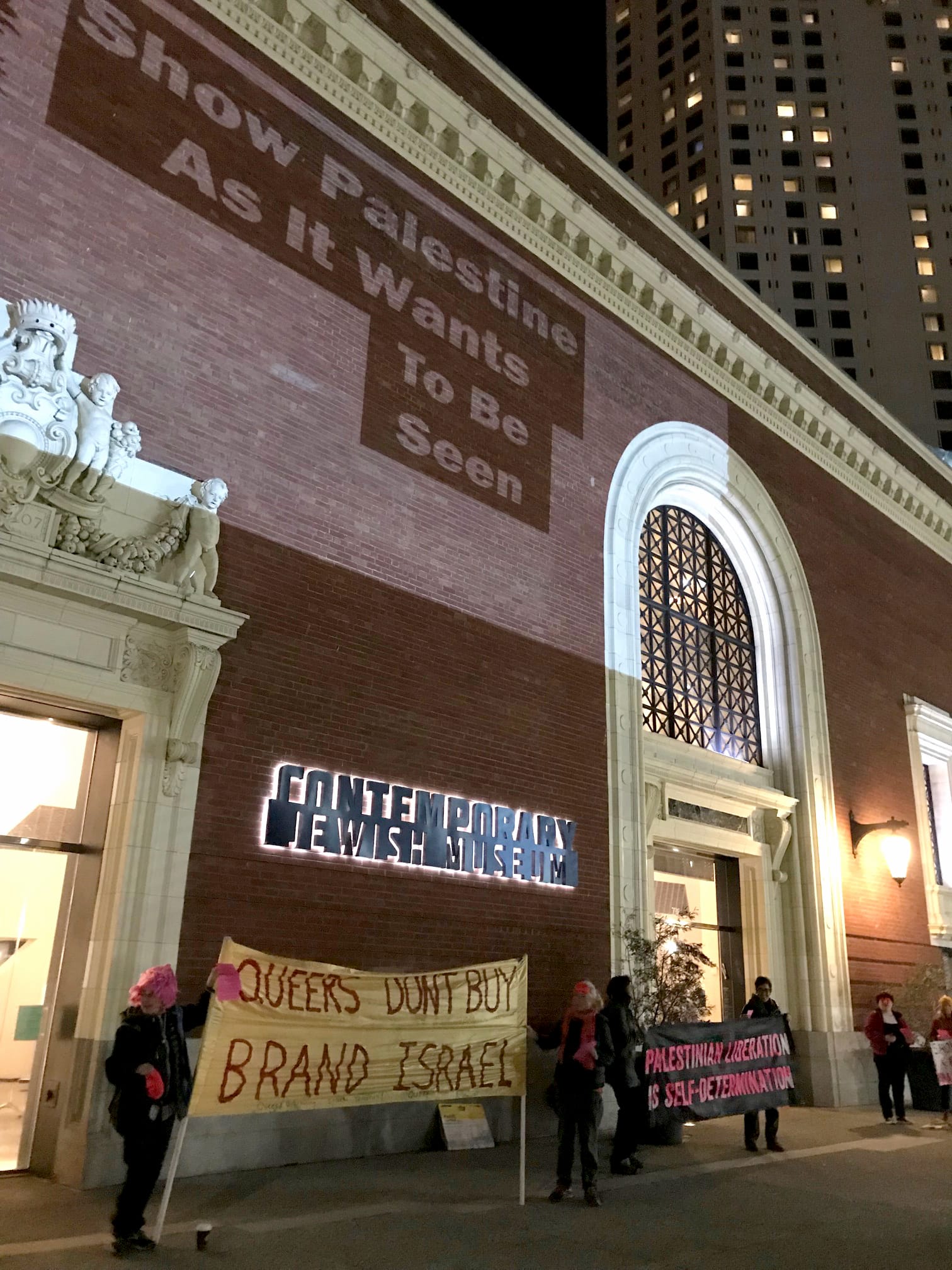 On Thursday, February 9, a crowd of activists and artists gathered at the Contemporary Jewish Museum (CJM) in San Francisco carrying protest signs reading “Unmask Israeli Apartheid” and “Palestinian Liberation Is Self-Determination.” On the front of the institution, they projected phrases like “Show Palestine As it Wants to be Seen” and “Unmask Zionism.” Their protest came just two days after the opening of CJM’s exhibition Show Me as I Want to Be Seen.