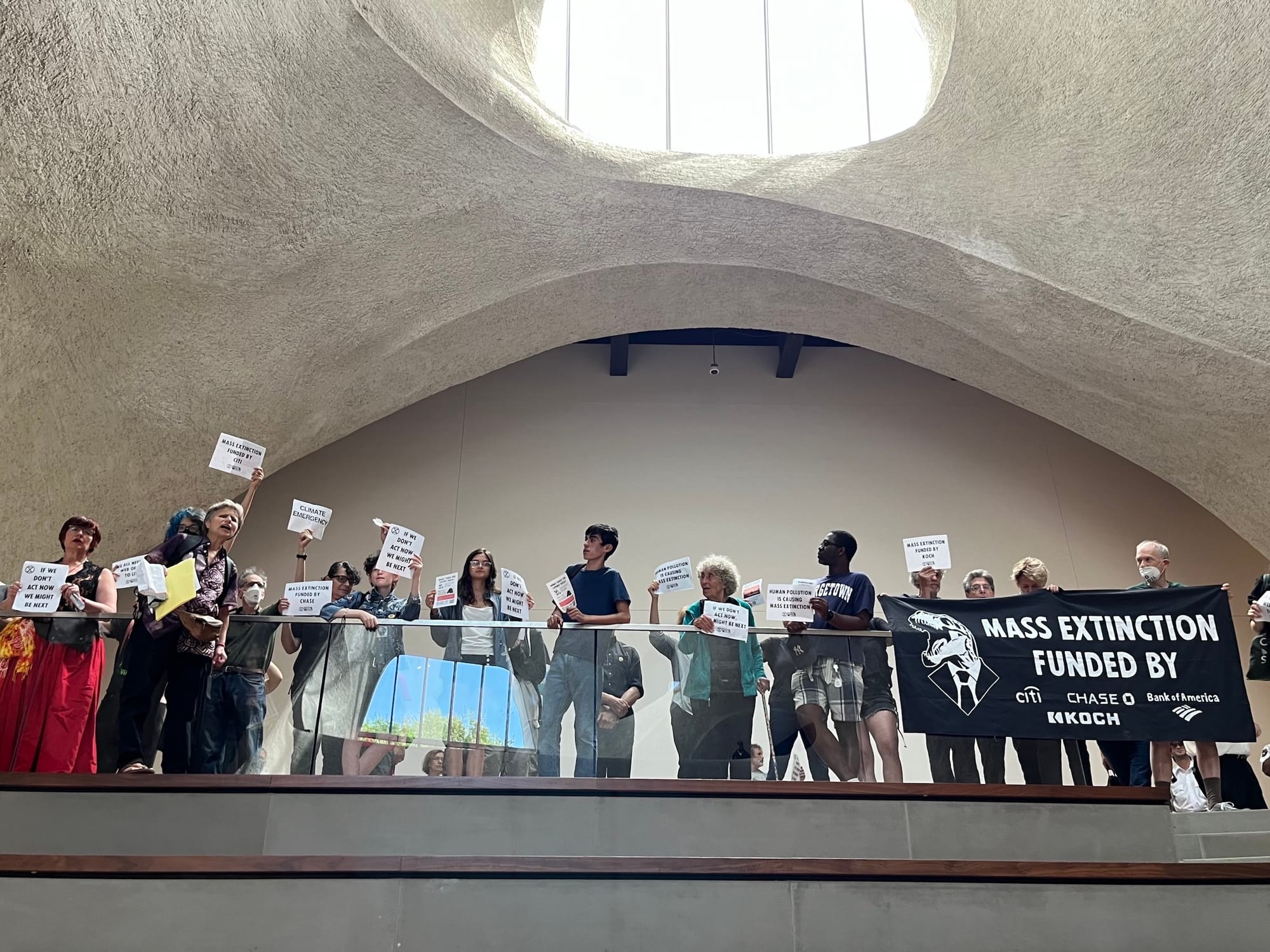 A large black banner they held read, "Mass extinction funded by Citi, Chase, Bank of America, Koch Industries." The three major banks, all listed as AMNH corporate patrons, are heavily invested in fossil fuel businesses, according to the protesters.