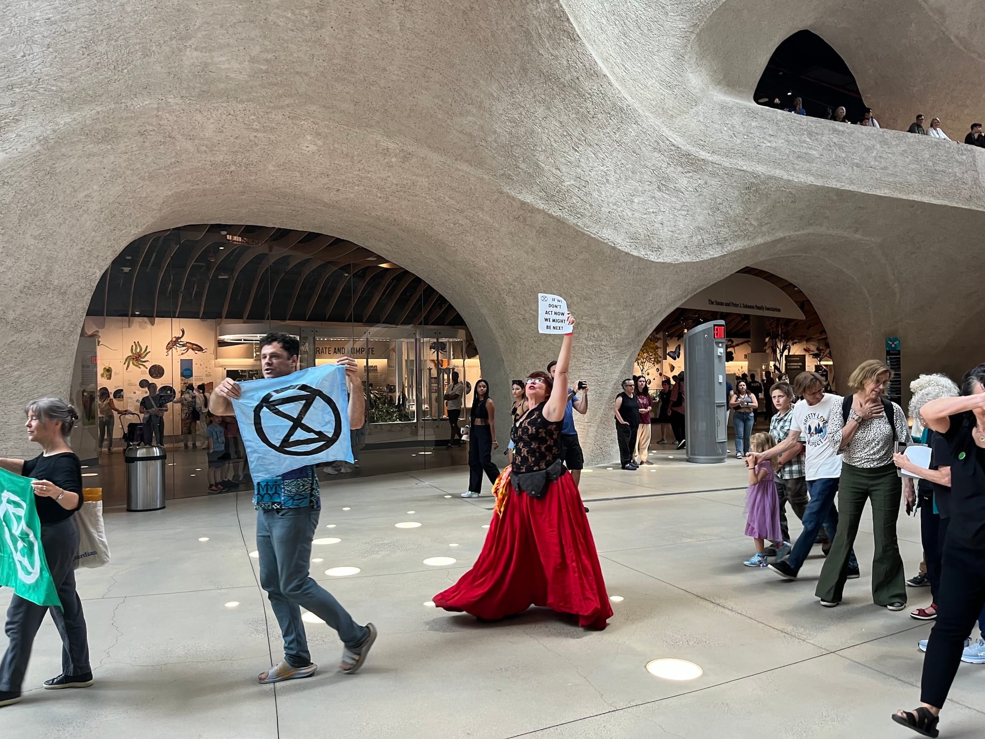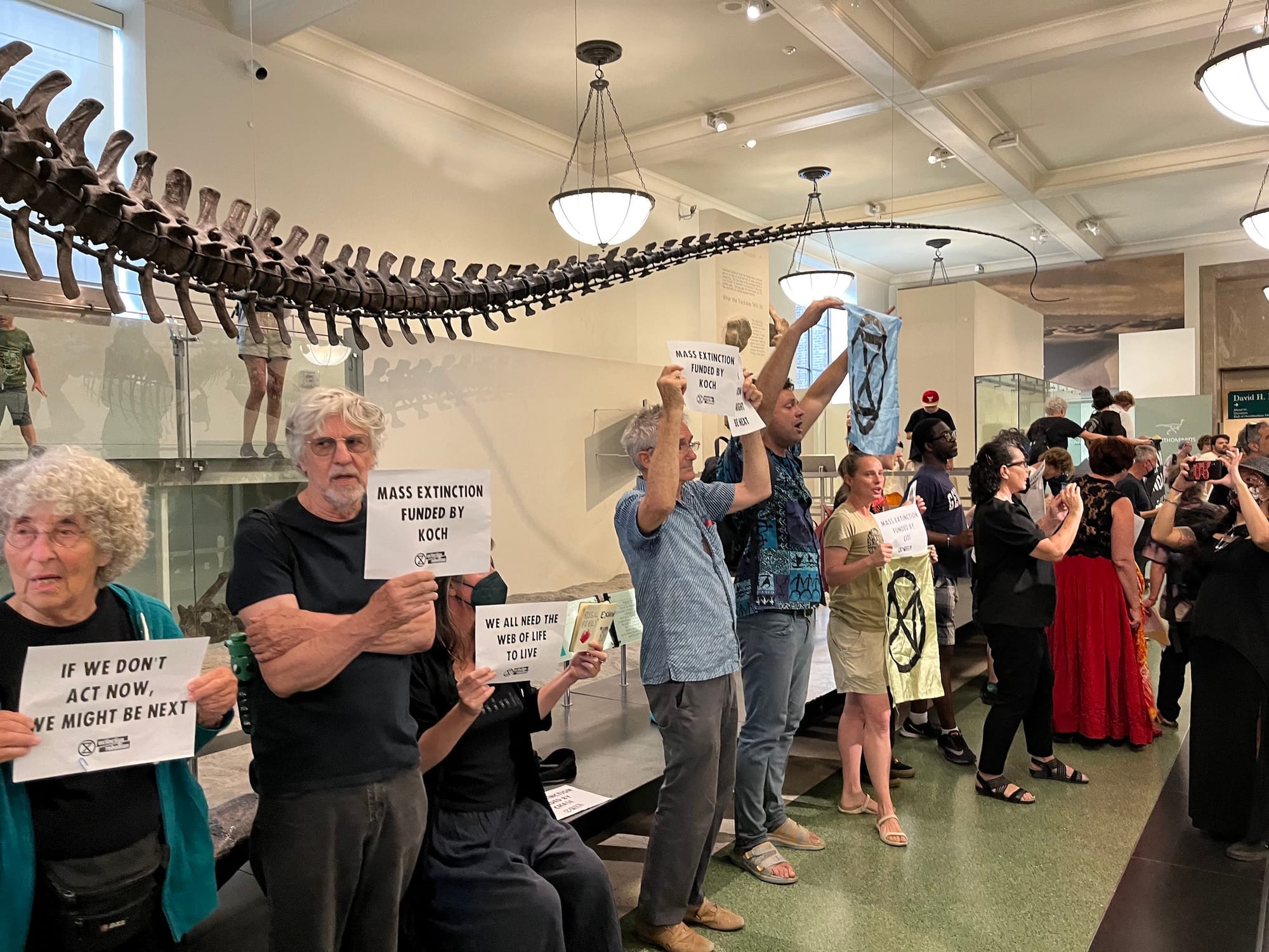 The protestors entered the museum surreptitiously around noon on a busy Labor Day weekend. They filed up toward the David H. Koch Dinosaur Wing on the fourth floor, milling around incognito until they launched into their first chant at 12:20.
