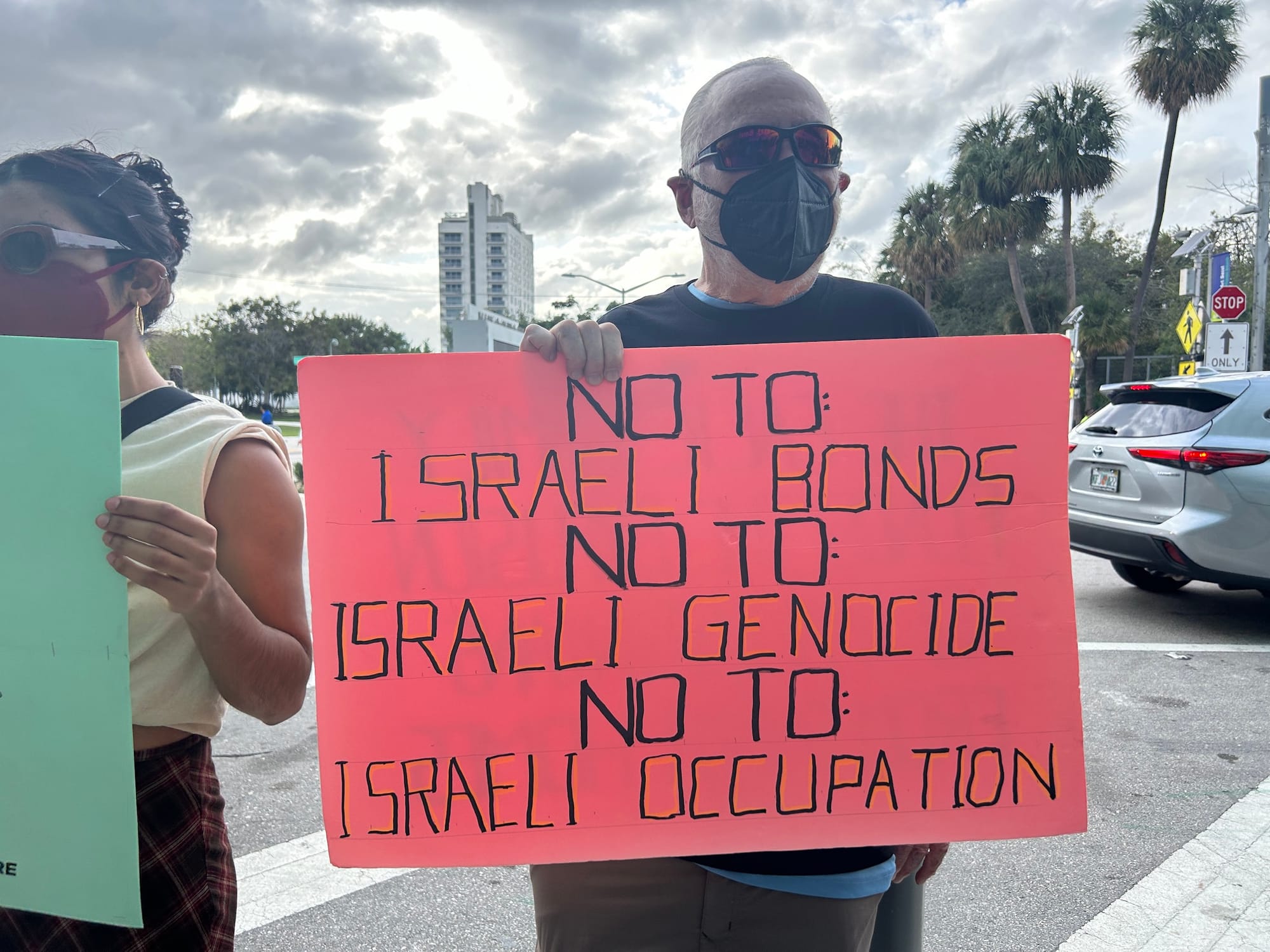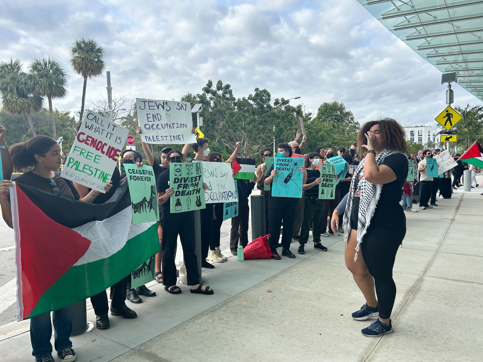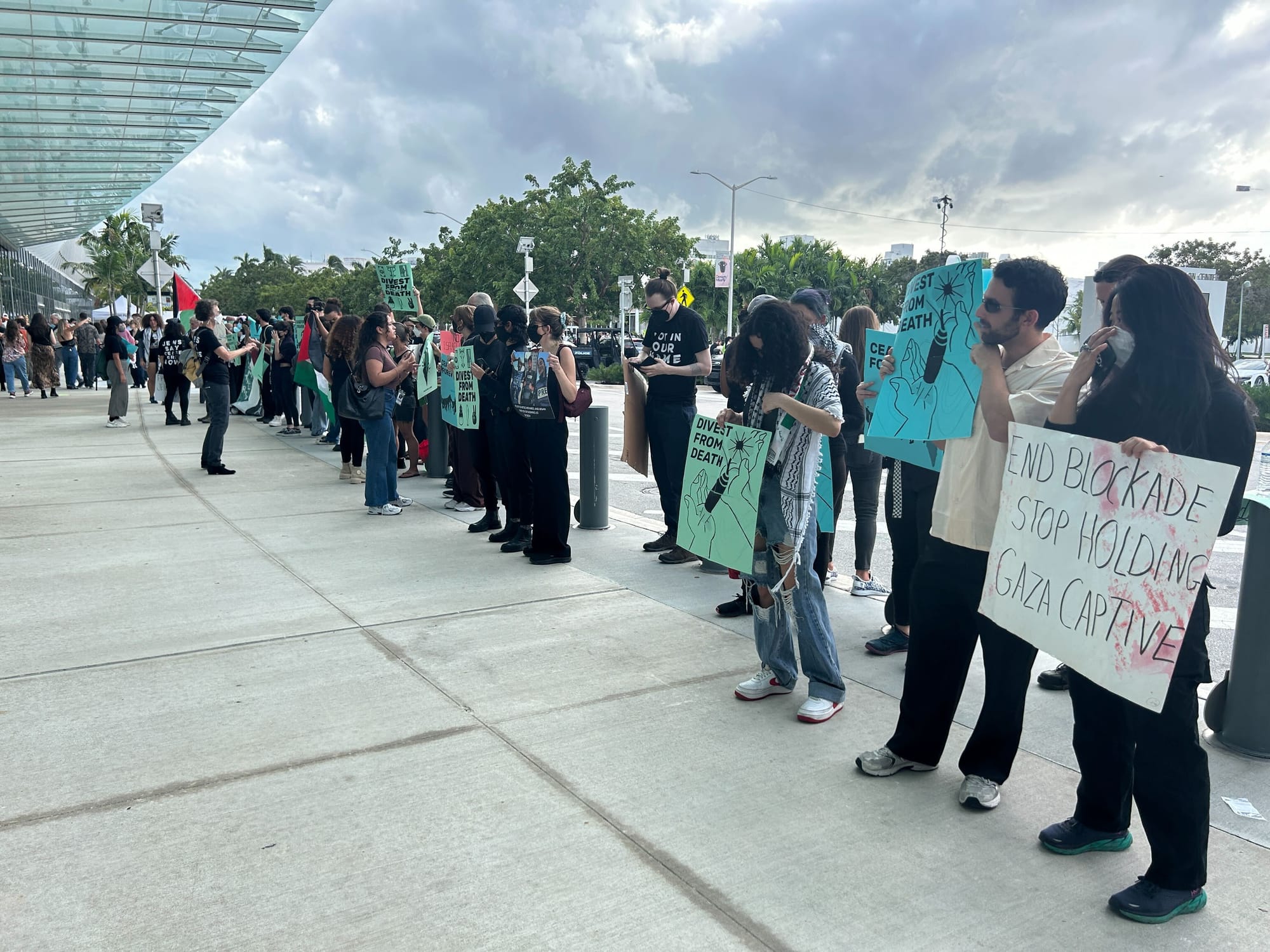 Under the collective name South Florida Coalition for Palestine, the ad hoc group of over 100 demonstrators includes both cultural workers and members of the nationwide anti-Zionist group Jewish Voice for Peace (JVP).