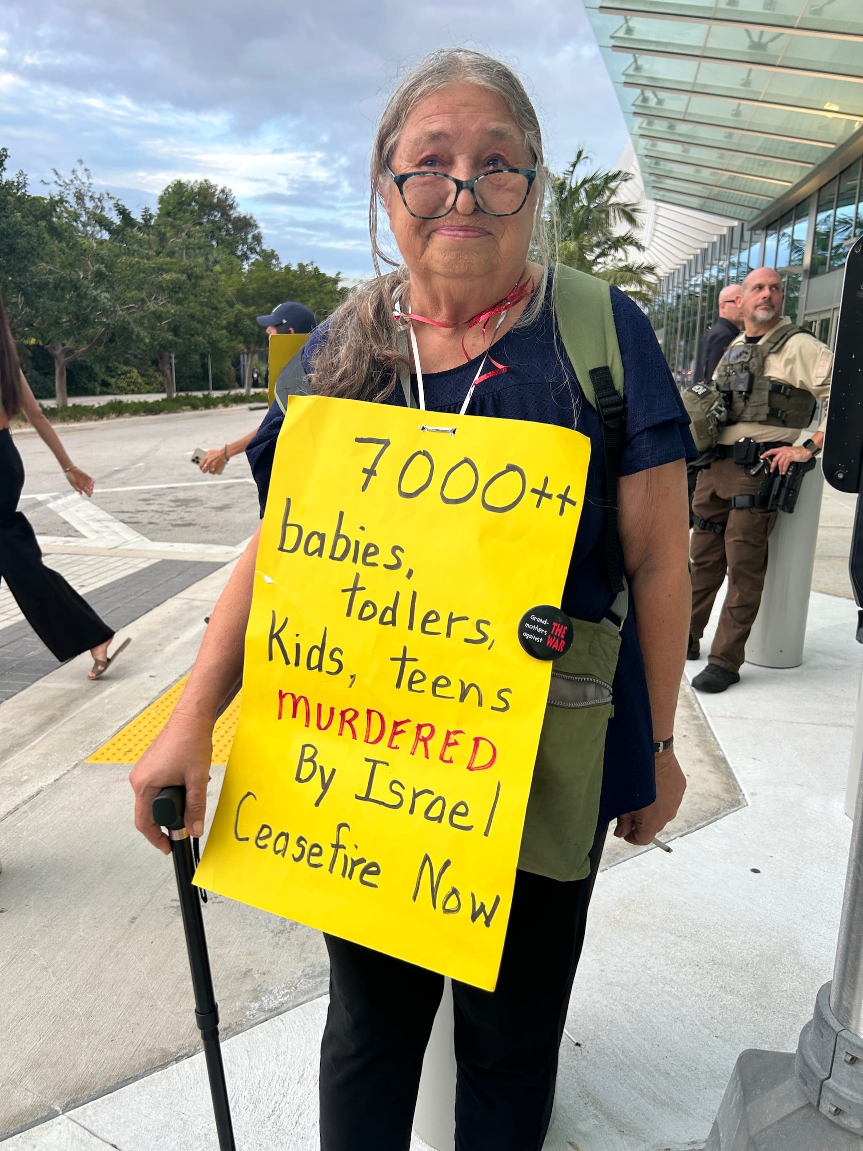 Marty Rajandram, a Miami resident who was at the protest today, said that as a senior citizen she could not afford to visit Art Basel — where even a discounted ticket for people over 62 costs $58 — and that she had come to the Convention Center specifically for the action. She wore a bright yellow sign bearing the number of Palestinian children killed in the last two months: nearly 7,000.