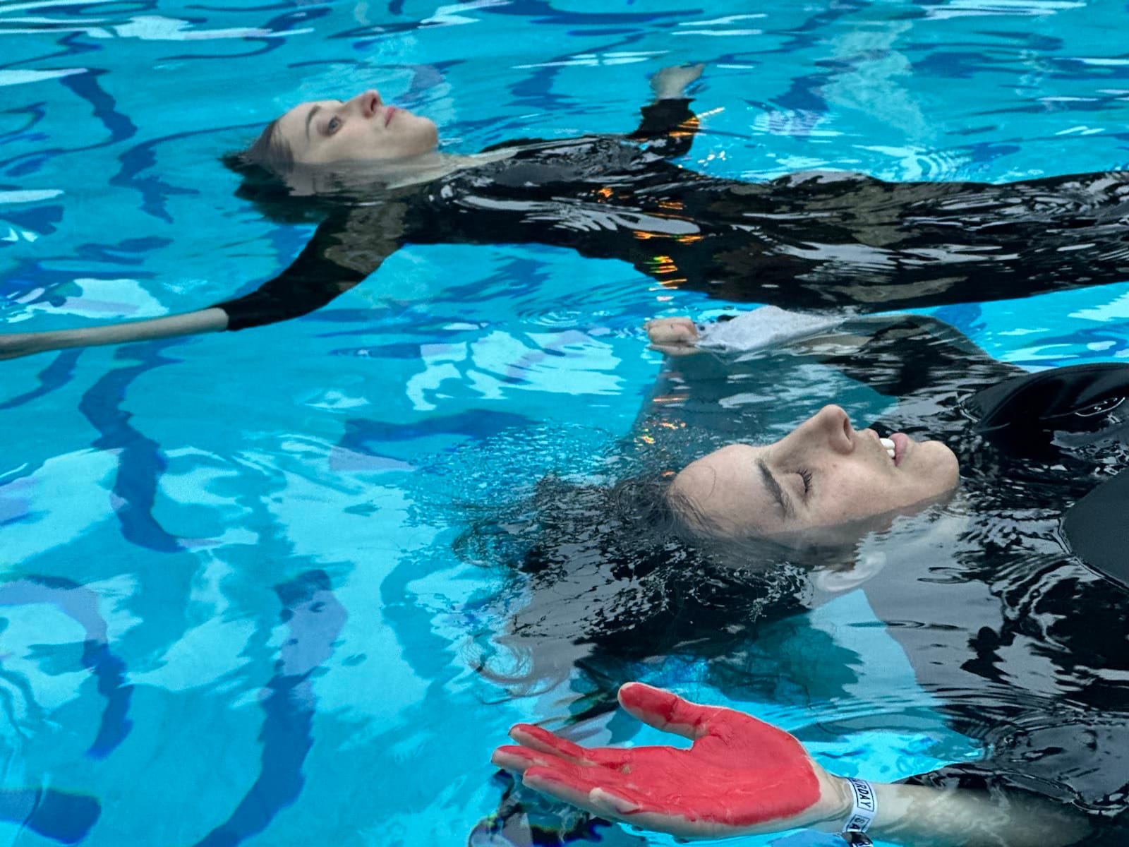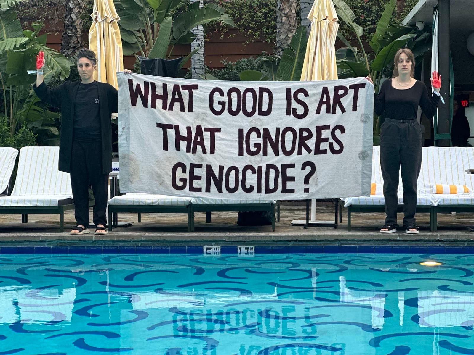 Later on Saturday, a contingent of protesters made their way to Felix Art Fair at the Roosevelt Hotel in Hollywood. At the pool in the center of the show, two artists unveiled the same banner reading “What Good Is Art That Ignores Genocide?” while standing silently for 10 minutes with one hand raised, palm painted red. Many visitors took photos. As hotel staff approached the artists, they chanted “free, free Palestine!” and fell backwards into the pool, floating on their backs for another 10 minutes in a “die in.”