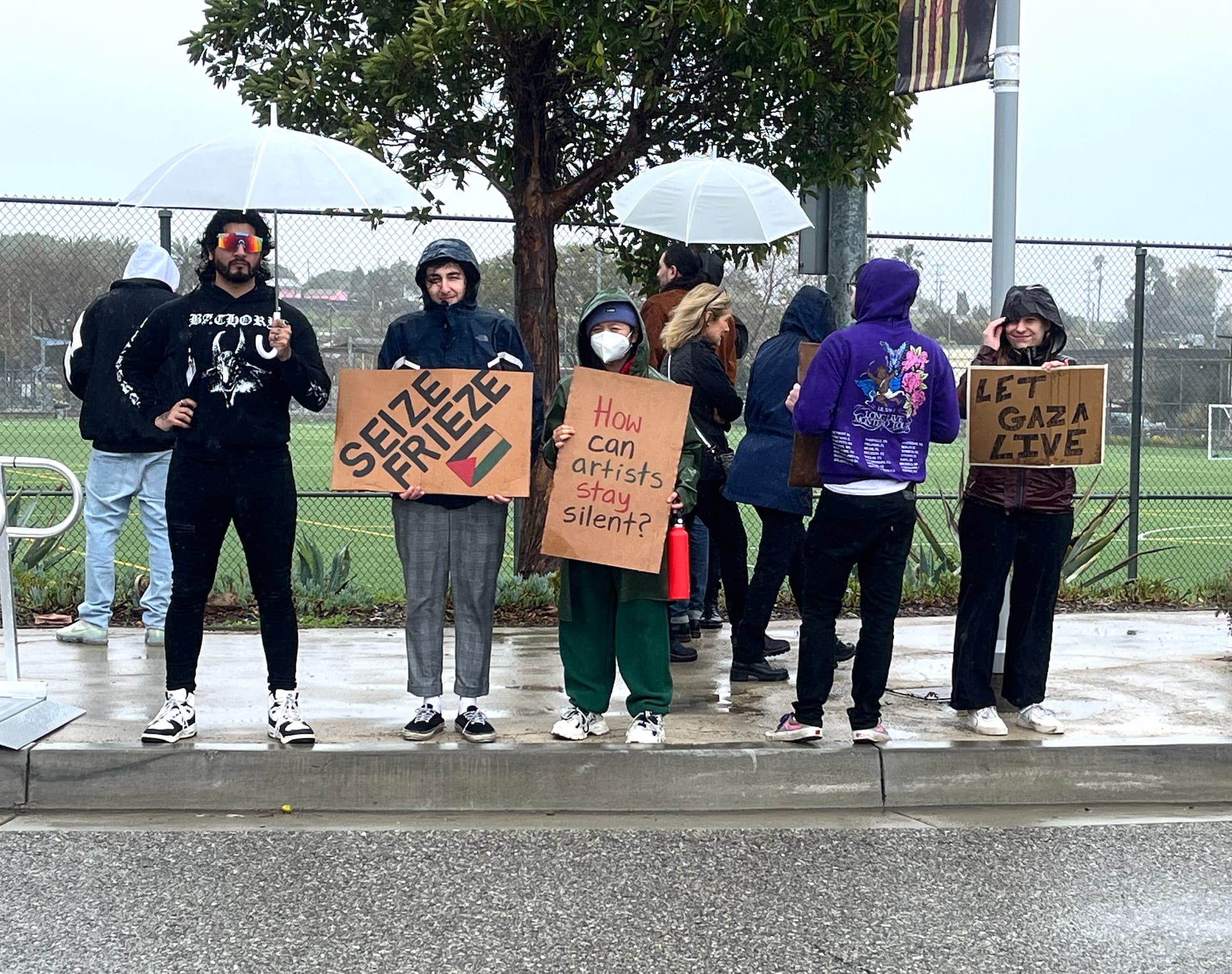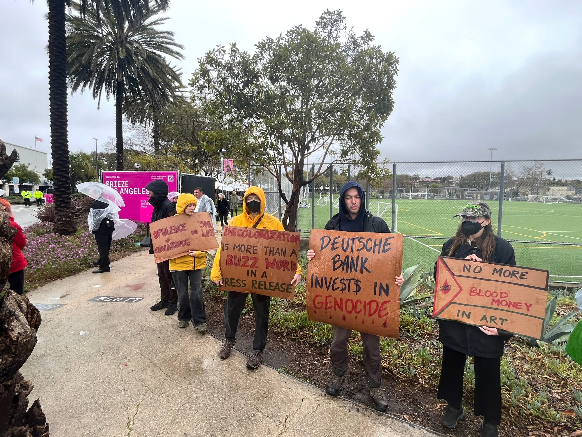 LOS ANGELES — In pouring rain, a group of 20 unaffiliated cultural workers gathered to protest the United States’s continued funding of Israel’s attacks on Gaza. Citing Frieze partner Deutsche Bank's ties to Israel, the organizers rallied outside of the fair entrance at Santa Monica Airport during peak visiting hours on Saturday, March 2 from 11am to 2pm.