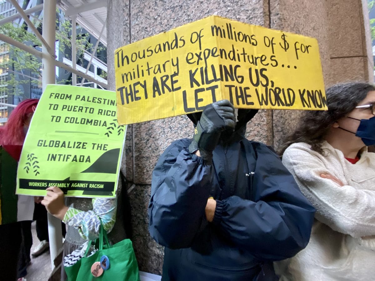 At the demonstration, Clarissa Hernandez of the Workers Assembly Against Racism brandished a hand-painted sign with the flags of Colombia, Palestine, and Puerto Rico -- countries whose struggles, she said, are “especially interconnected, in that they are all made worse by US intervention.”