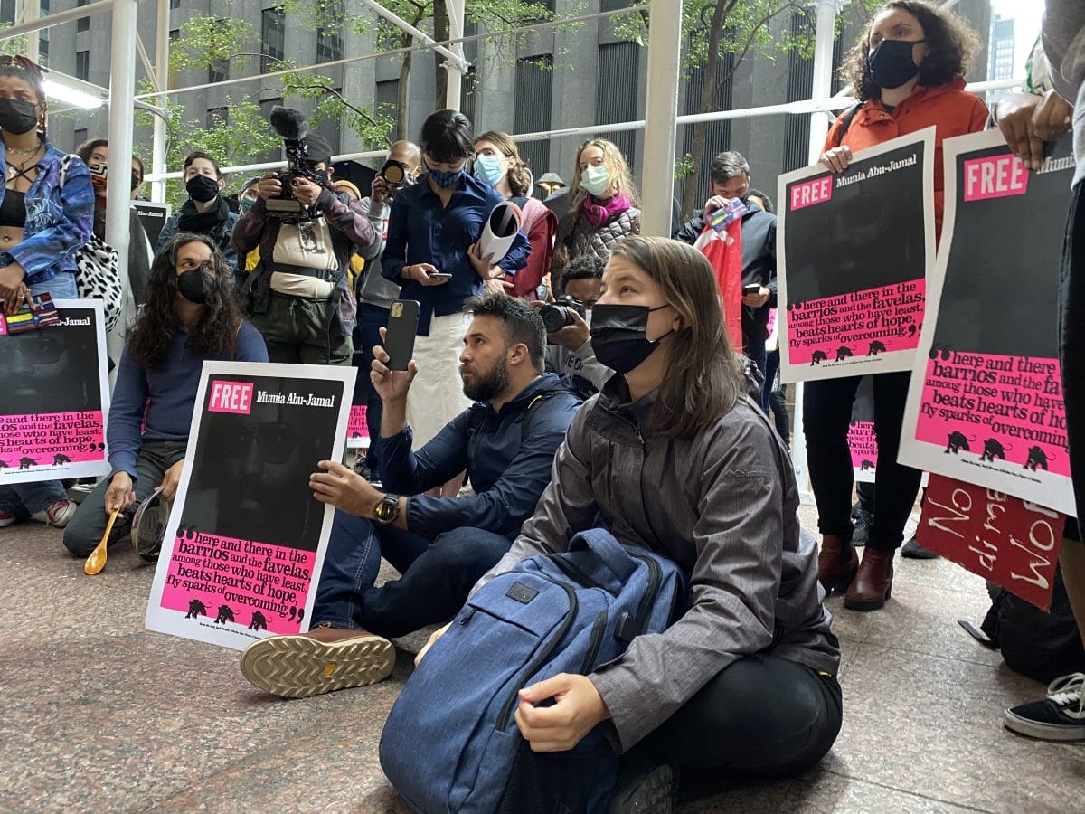 Protesters chanted “USA, CIA, get out of Colombia” and held up placards and banners, including a poster of Abu-Jamal overlaid with a quote by the activist -- the latest in a series screen-printed by artist Kyle Goen for Strike MoMA and handed out freely to protesters each week.