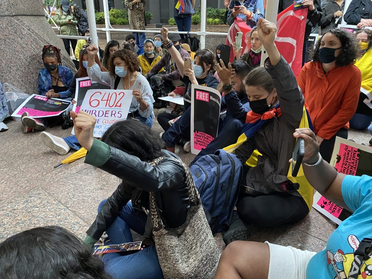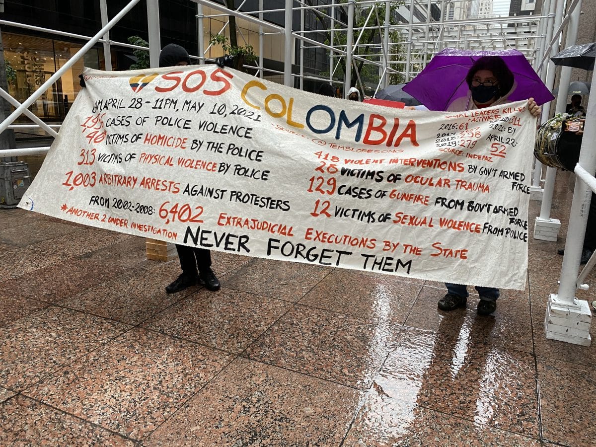 Colombia’s uprising was at the center of a protest held today across from the Museum of Modern Art (MoMA). For the last two months, activist groups have exposed museum trustees’ indirect ties to human rights abuses around the world in a series of weekly actions, online seminars, and social media campaigns organized under the banner of “Strike MoMA.”