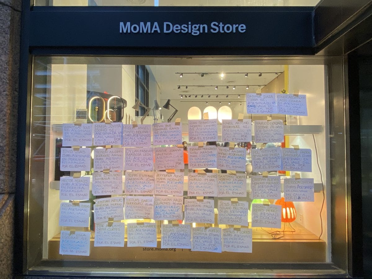 Sheets of paper with the names of individuals killed by the Mobile Anti-Disturbances Squadron (ESMAD), Colombia’s riot police, covered a glass window of MoMA’s Design Store, adjacent to Strike MoMA’s meeting place at Manhattan’s Urban Plaza. Later, the demonstrators marched four blocks to the midtown offices of Point Lookout Capital Partners, a New York firm that owns Combined Systems Inc. -- the supplier of “less-lethal” munitions used by ESMAD.