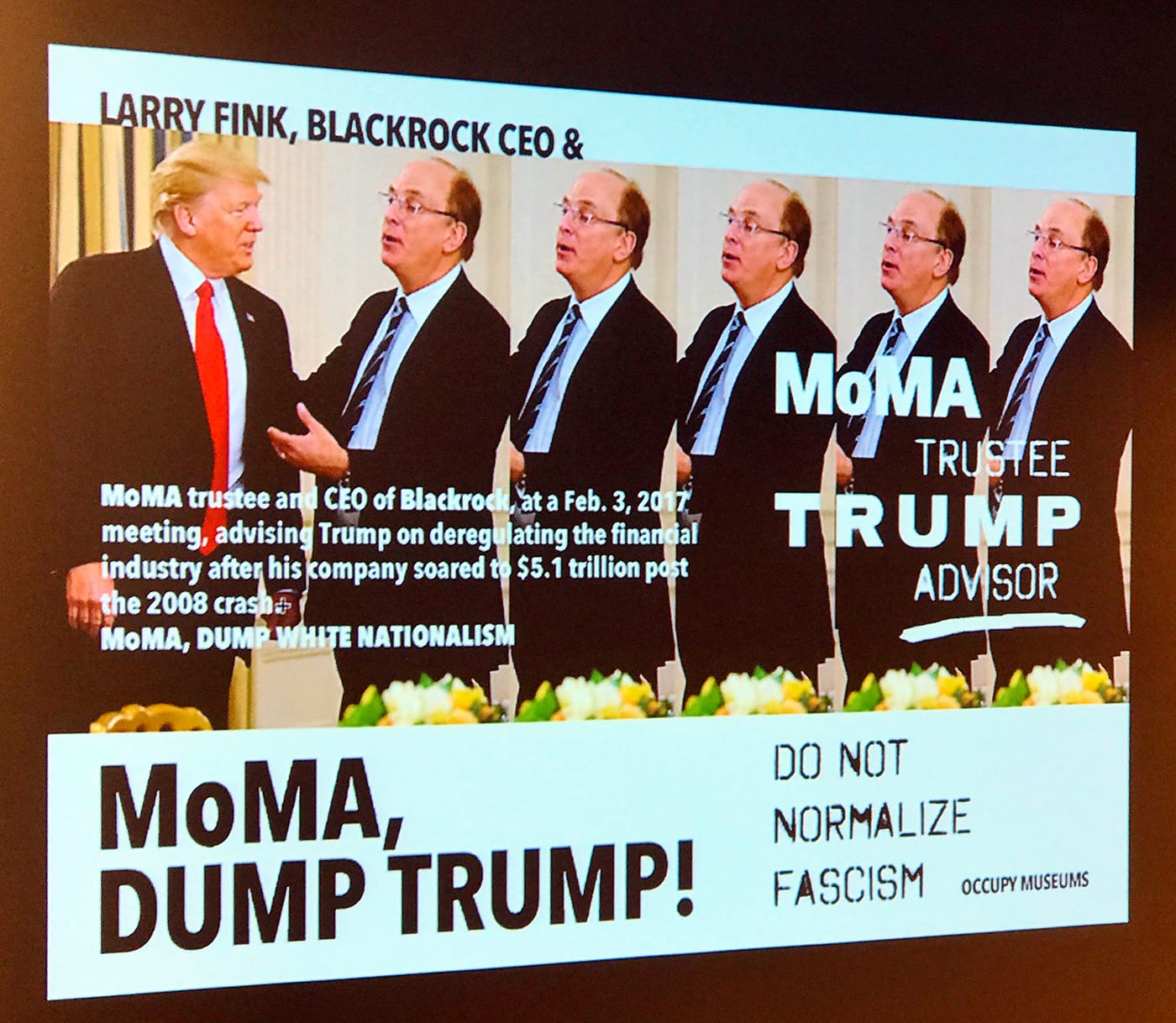 It has come to our attention that a Trump economic advisor sits on the board of the Museum of Modern Art. The name of this advisor is Larry Fink. He is the co-founder and CEO of Blackrock Inc, the largest financial company in the world. Blackrock barely existed before 2008. Today it manages 5.1 trillion dollars of assets. If you hold any kind of debt to any bank, chances are that it’s traded by Blackrock. The firm is deeply invested in Americans—and especially students to remain in permanent debt. Fink is also on the board of NYU.