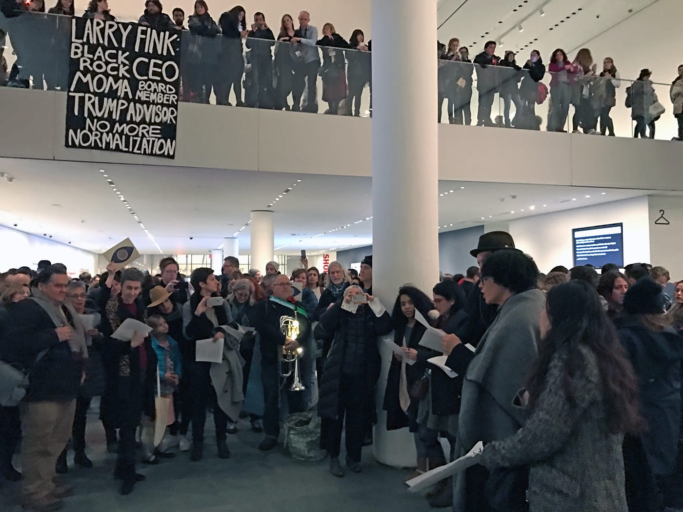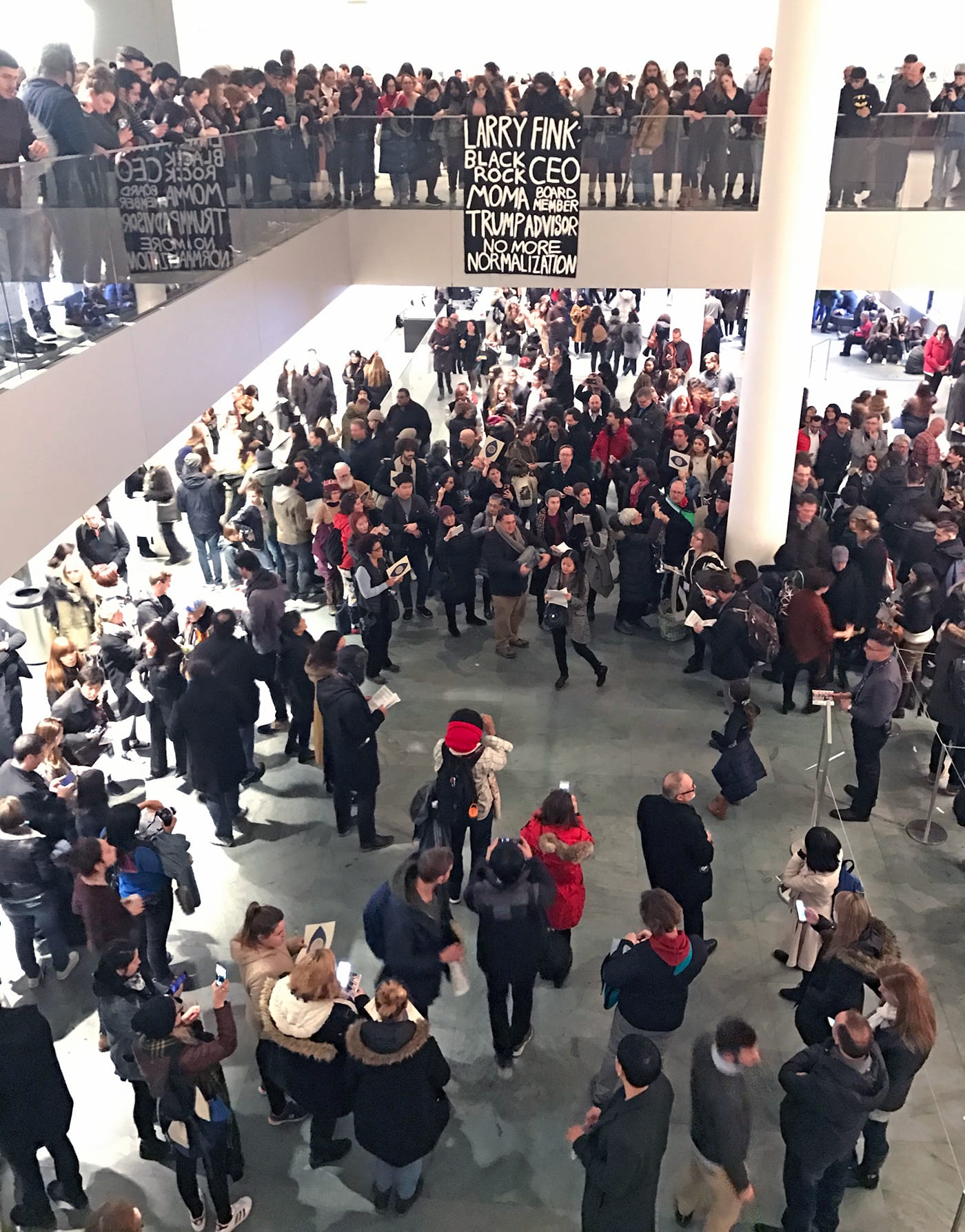 Last Friday, February 17, protesters marched from the 2017 College Art Association (CAA) conference to the entry hall of the Museum of Modern Art (MoMA) to demand that the institution remove Larry Fink, the CEO of BlackRock, from its board because of his ties to the Trump administration. The exact number of protesters taking part in the action was hard to calculate as many of them appeared indistinguishable from the MoMA visitors in the crowded lobby.
