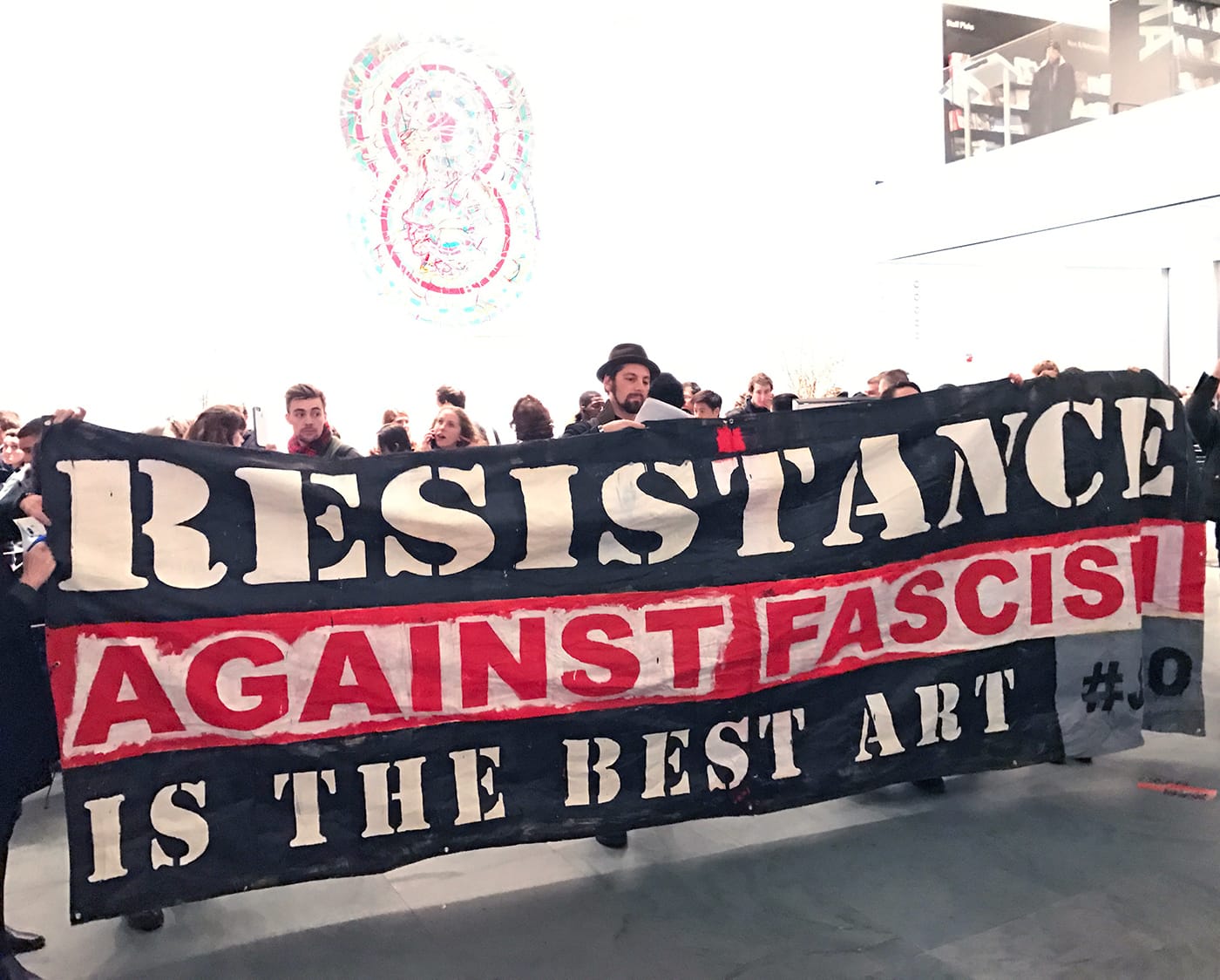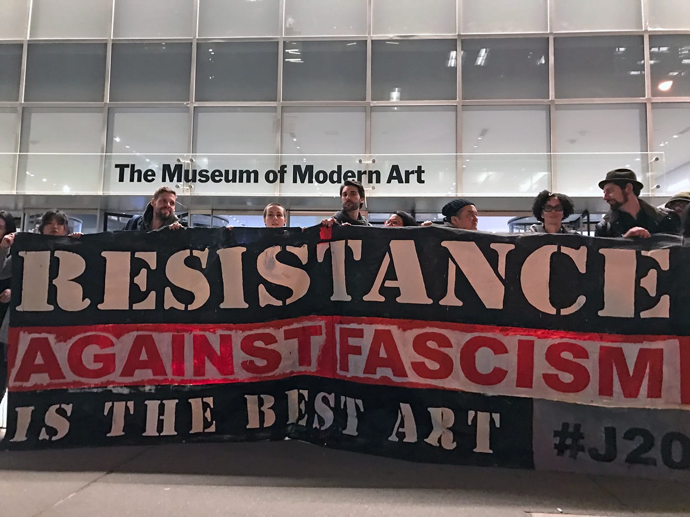 On Friday, protesters met in the MoMA lobby at 6pm EDT and unfurled a banner that read “Resistance Against Fascism Is the Best Art,” while Fusco reread the statement, another participant read “Poetry is Not a Luxury” by Audre Lorde, and another read from Walter Benjamin’s “On History.”