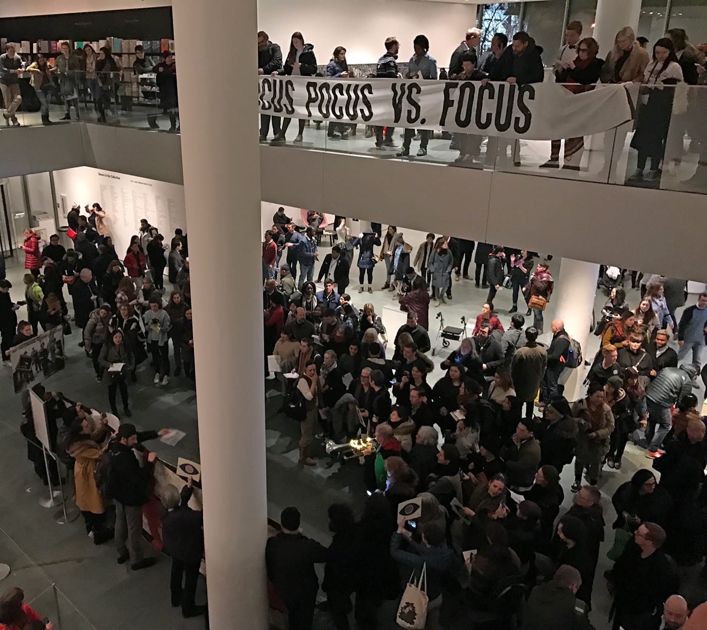 Protesters unfurled two banners from the balcony around the information desks of the museum. One clearly took aim at Fink; the other was more cryptic and read, “Hocus Pocus vs. Focus.” The words of the protesters were echoed using the people’s microphone technique popularized by the Occupy movement.