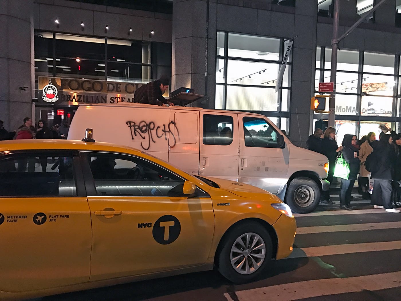 The protest then moved outside onto 53rd Street, where the Illuminator was projecting phrases onto the museum’s façade, including “Fire Fink,” “Evict Trump from MoMA,” and “MoMA Don’t Normalize Trump.” Protesters repeated the readings from earlier and also invited anyone to add their voice to the protest.