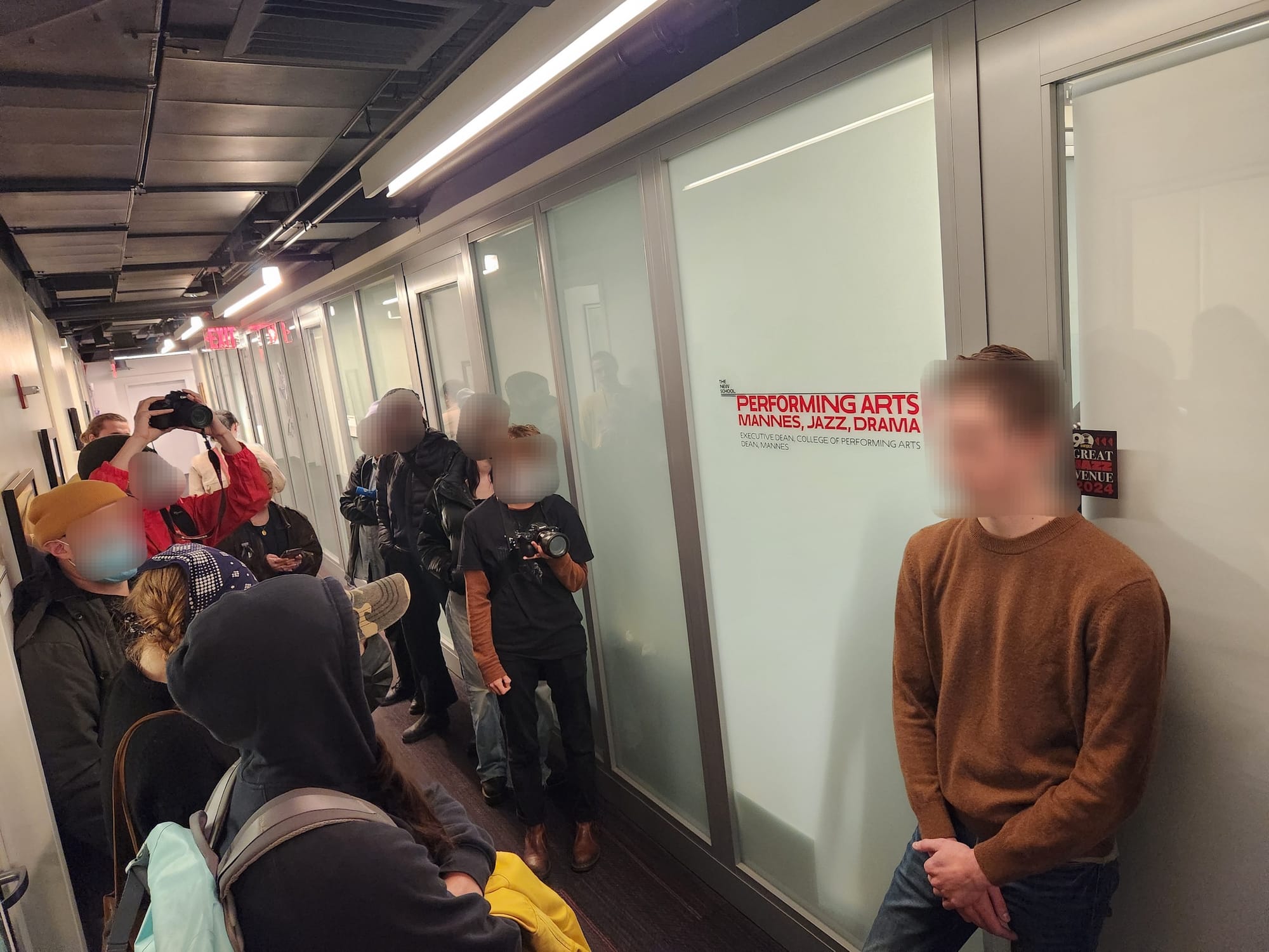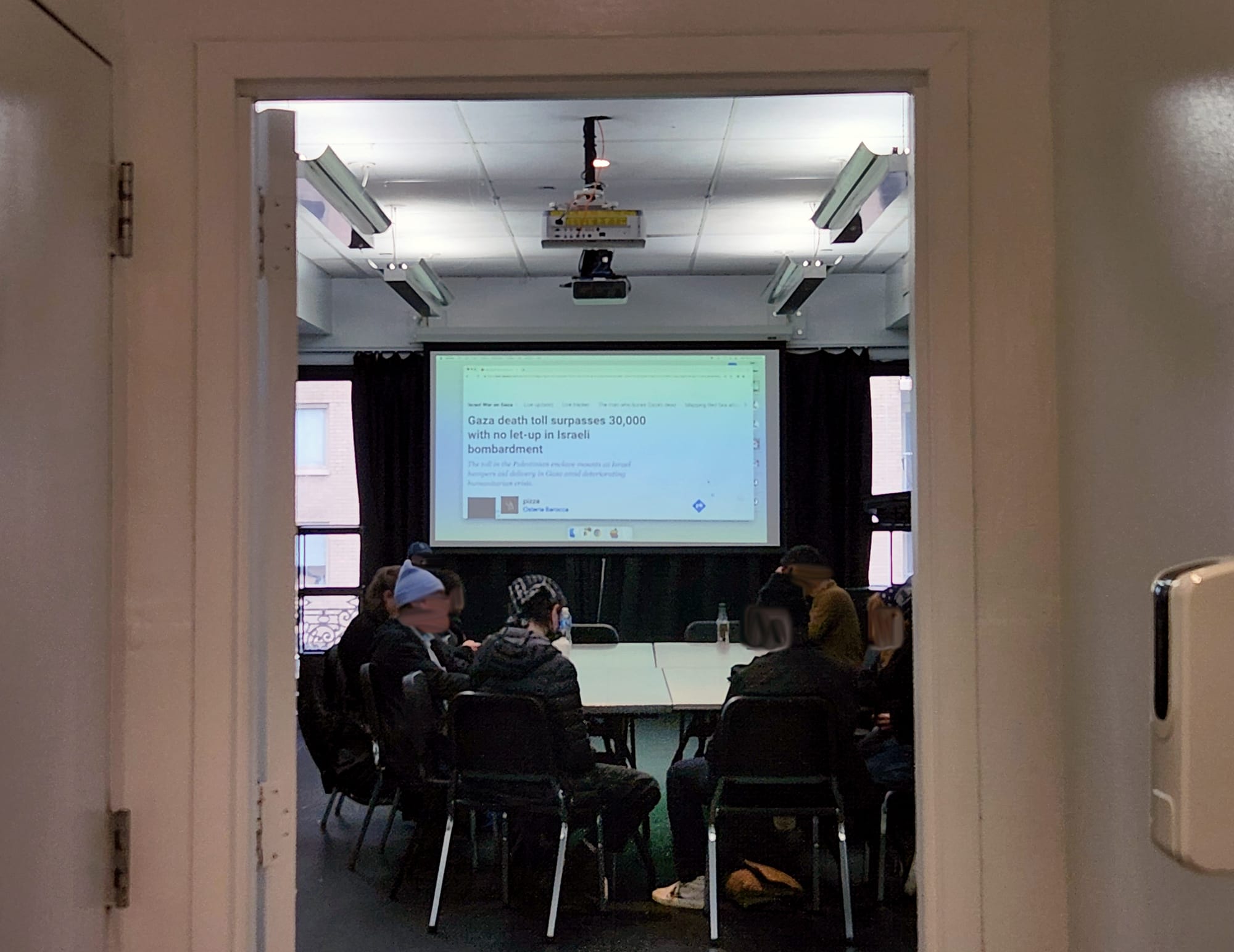 The demonstration unfolded on the first day of the New School's academic student workers' strike under a light rain. At around 2pm, approximately 20 students and faculty members gathered in a presentation room on the ninth floor of Arnhold Hall, which was reserved from 2:30pm onwards for the Hillel-led event, and refused to vacate when the event organizers arrived for setup. One person displayed an Al-Jazeera article about the Palestinian death toll of Israel's attacks surpassing 30,000 on the room's projector as the group sat quietly and refused to leave.