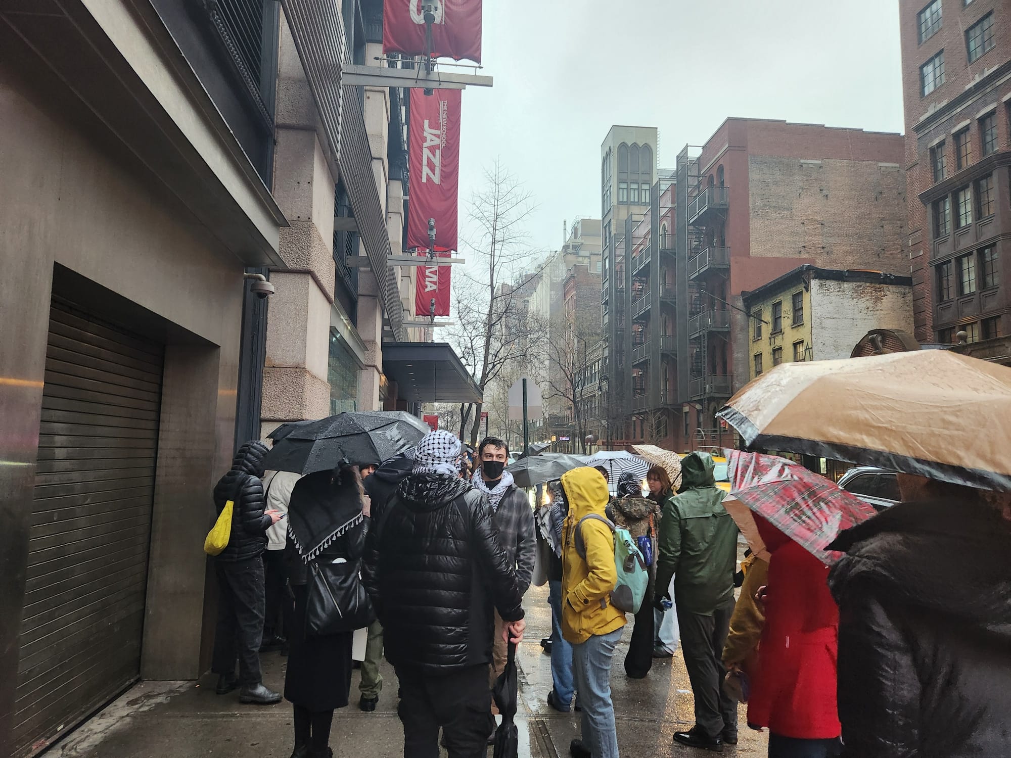 The protesters called out "shame" and "30,000 killed" to those exiting, and joined the outdoor demonstrators afterwards as buckets of rain dumped over Manhattan.