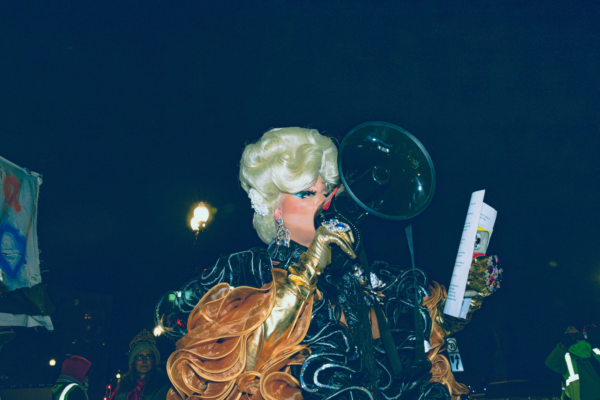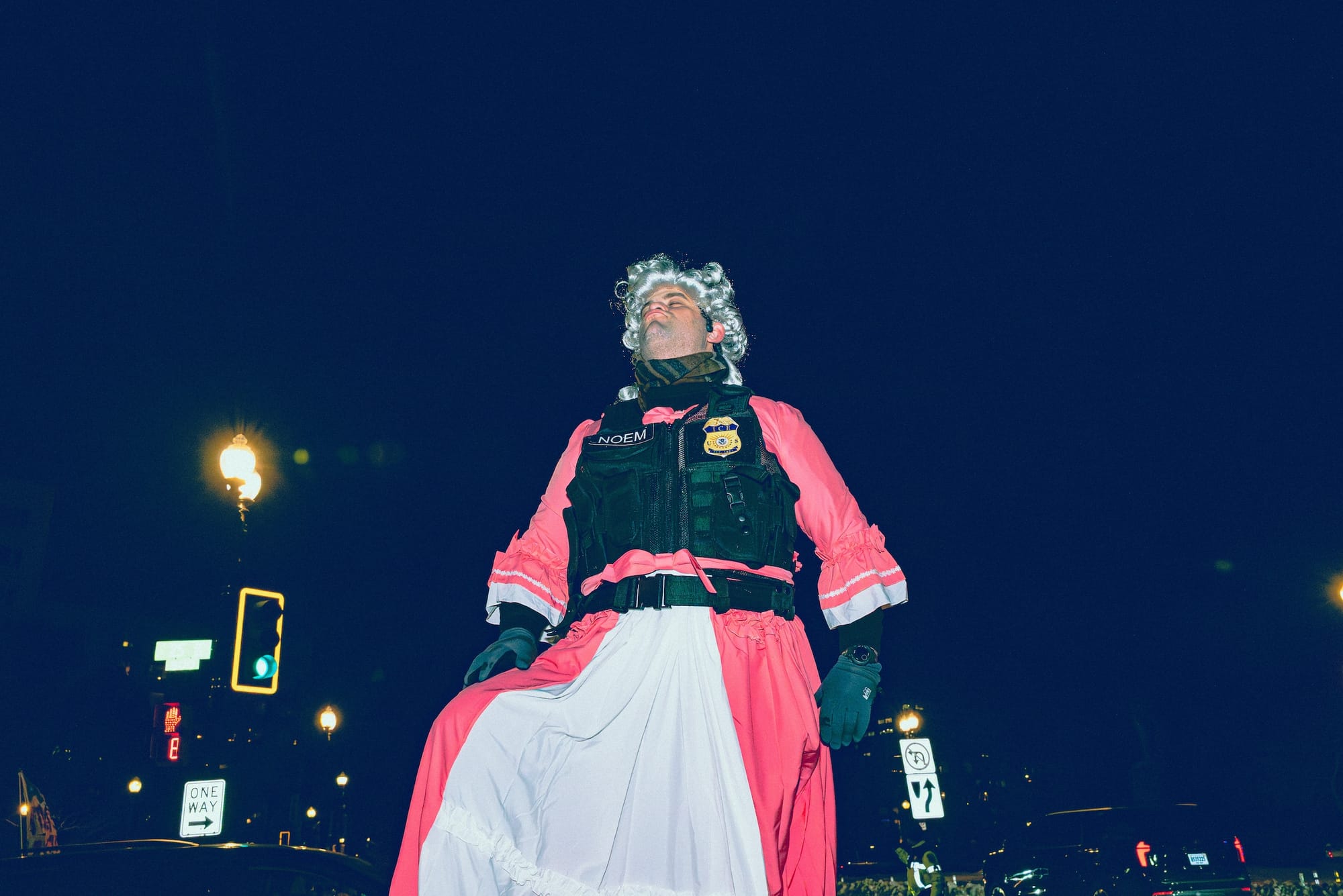 And show up they did — including one woman dressed as a Hamburglar version of Melania, a man wearing a long pink gown underneath a tactical vest embroidered with the last name “Noem,” and local drag queen Tara Hoot wearing a sparkling boa.