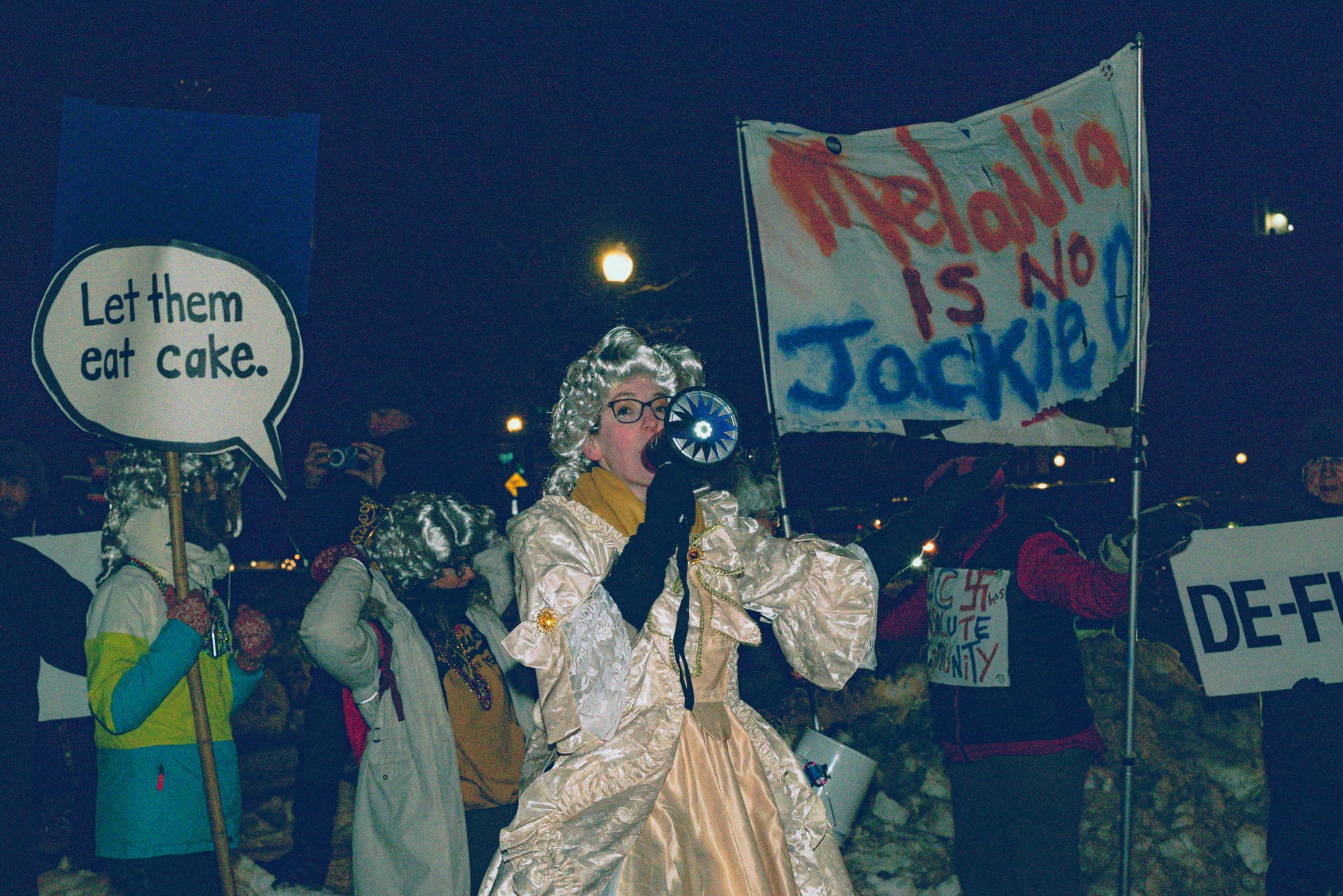Gathered around a cardboard three-tier cake and raising plastic champagne glasses, they cheered and rang bells as an organizer blared into a megaphone: “When loan forgiveness is cut, when crop prices soar and people have to choose between rent and medications and food, our dear queen Melania says 'Let them eat cake.'”