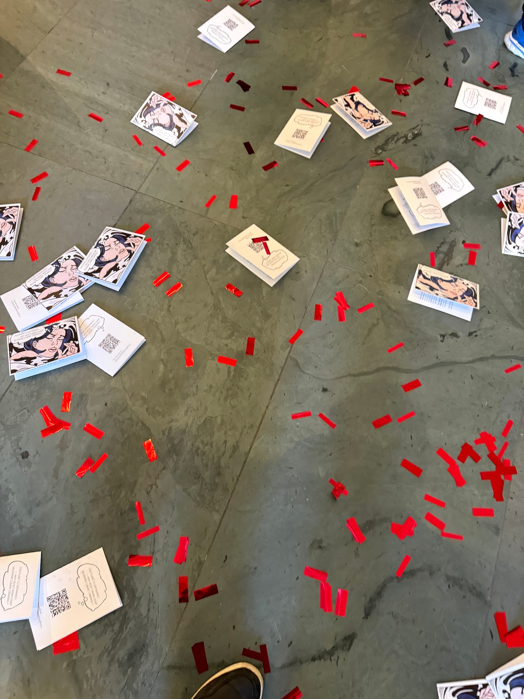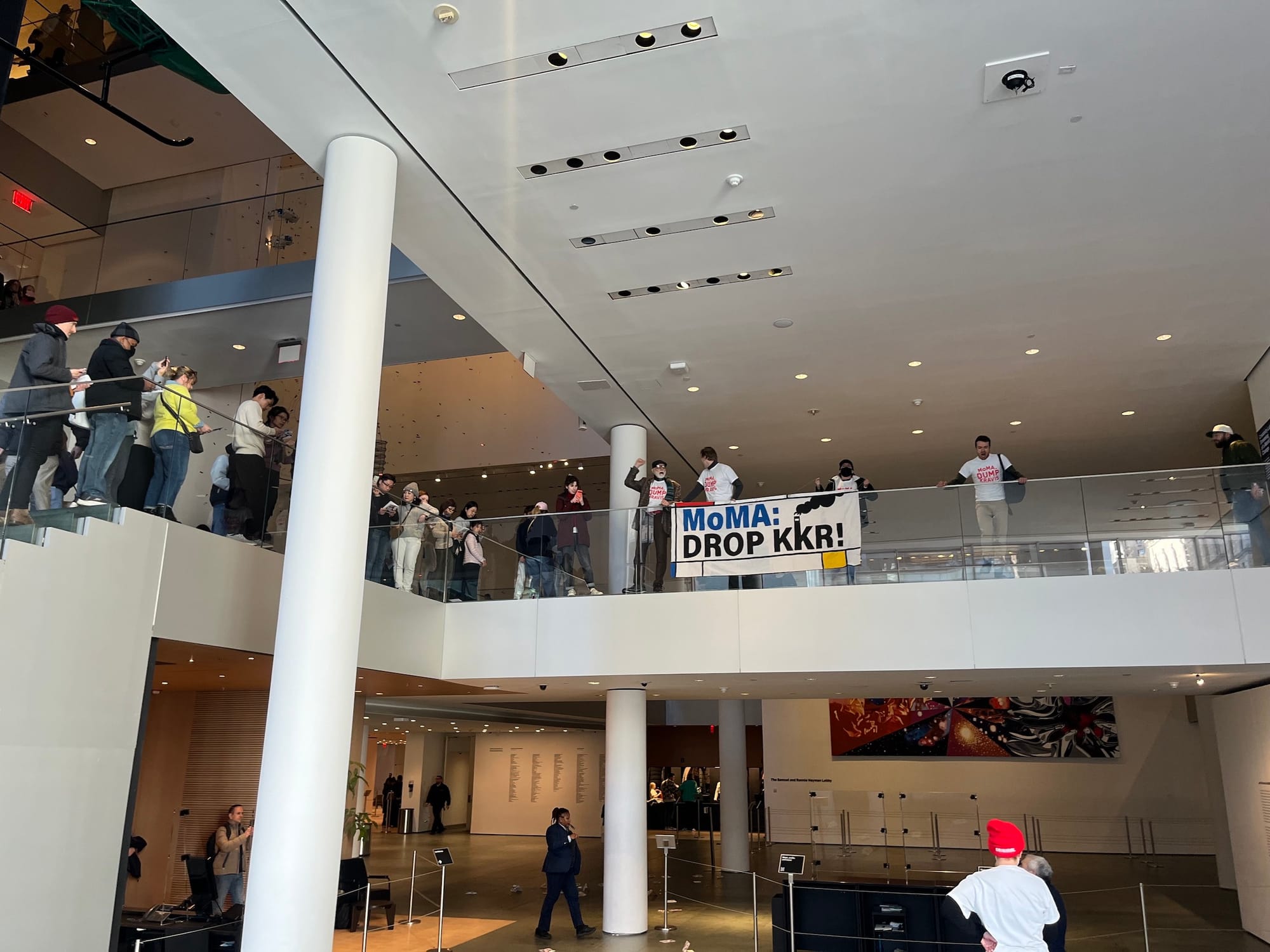 Protesters on upper floors dispersed shiny red confetti, which fluttered to the museum's ground floor in a distinctly Valentine's Day-themed display. Security quickly cleared the lobby. Museumgoers initially captured photos and videos of the protesters from the stairs surrounding the atrium, but MoMA staff soon restricted access to the space.