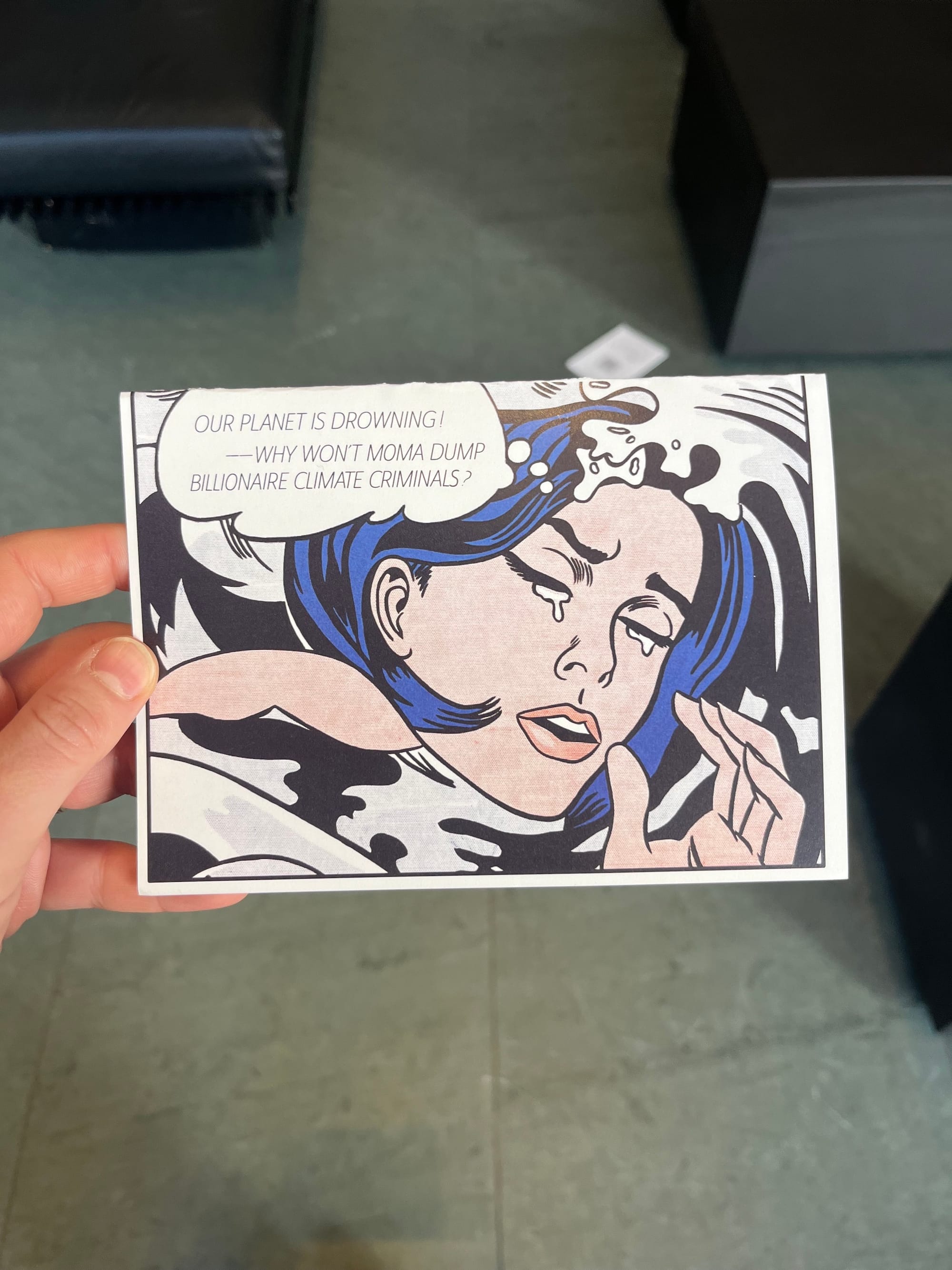 The activists discreetly entered the museum around noon. At 12:20pm, they unfurled banners bearing the words "MoMA Drop KKR" and unzipped their jackets to reveal white t-shirts printed with "MoMA Dump Kravis" in red lettering. They distributed eye-catching leaflets featuring a Roy Lichtenstein image of a woman crying with a speech bubble that read, “Our planet is drowning! Why won’t MoMA dump billionaire climate criminals?”