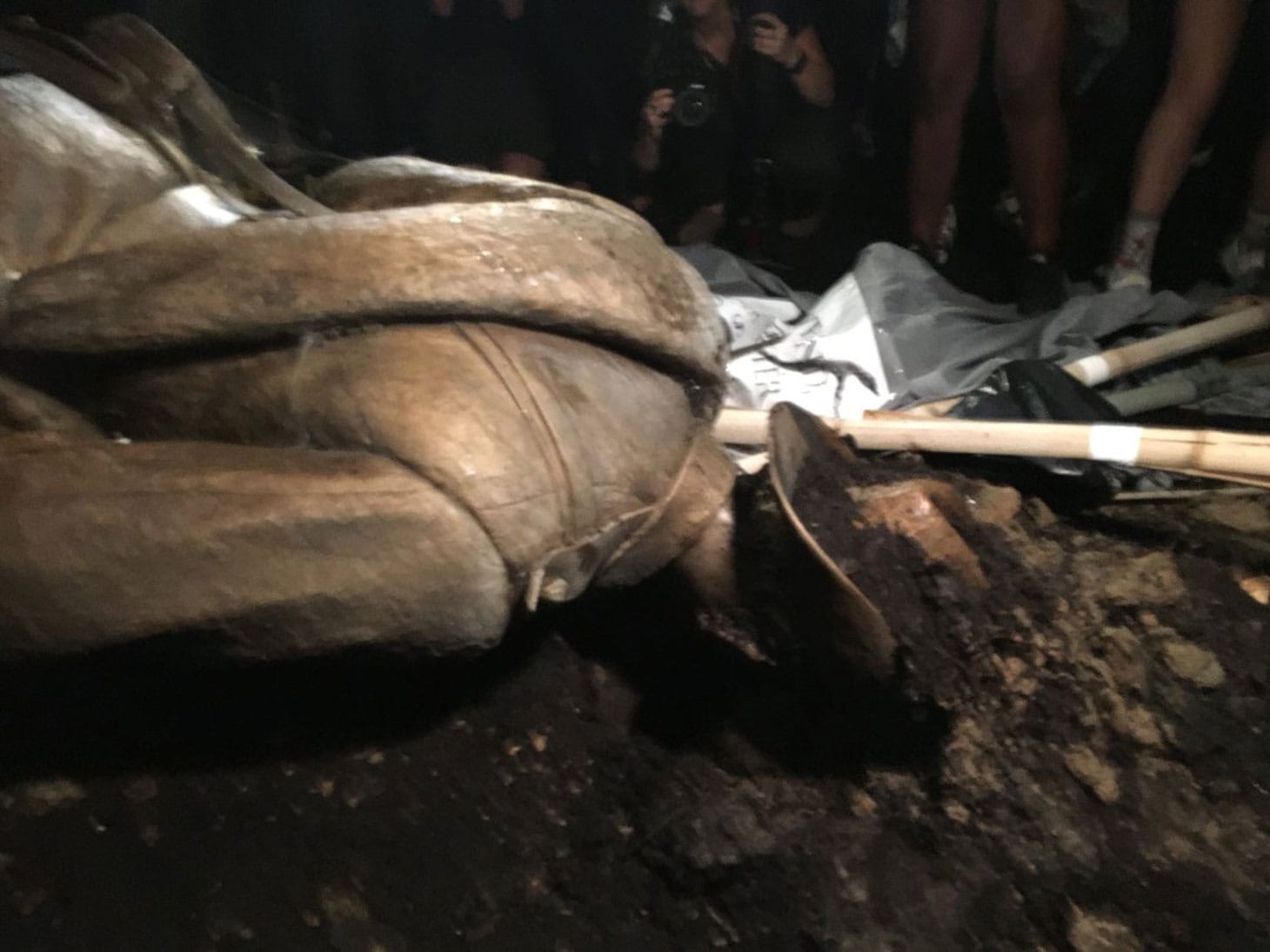 Moments after Silent Sam fell in August (image by and courtesy of Mike Ogle)