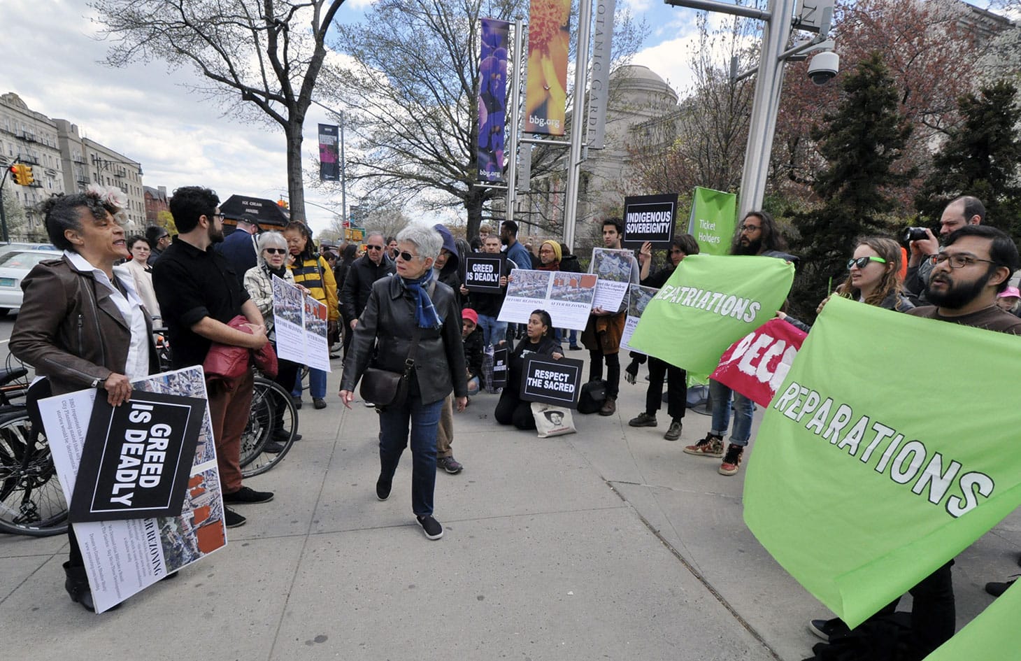 After a brief rally in front of the museum, protesters walked to the Brooklyn Botanic Garden entrance nearby on Eastern Parkway to raise awareness among visitors to the annual cheery blossom festival.