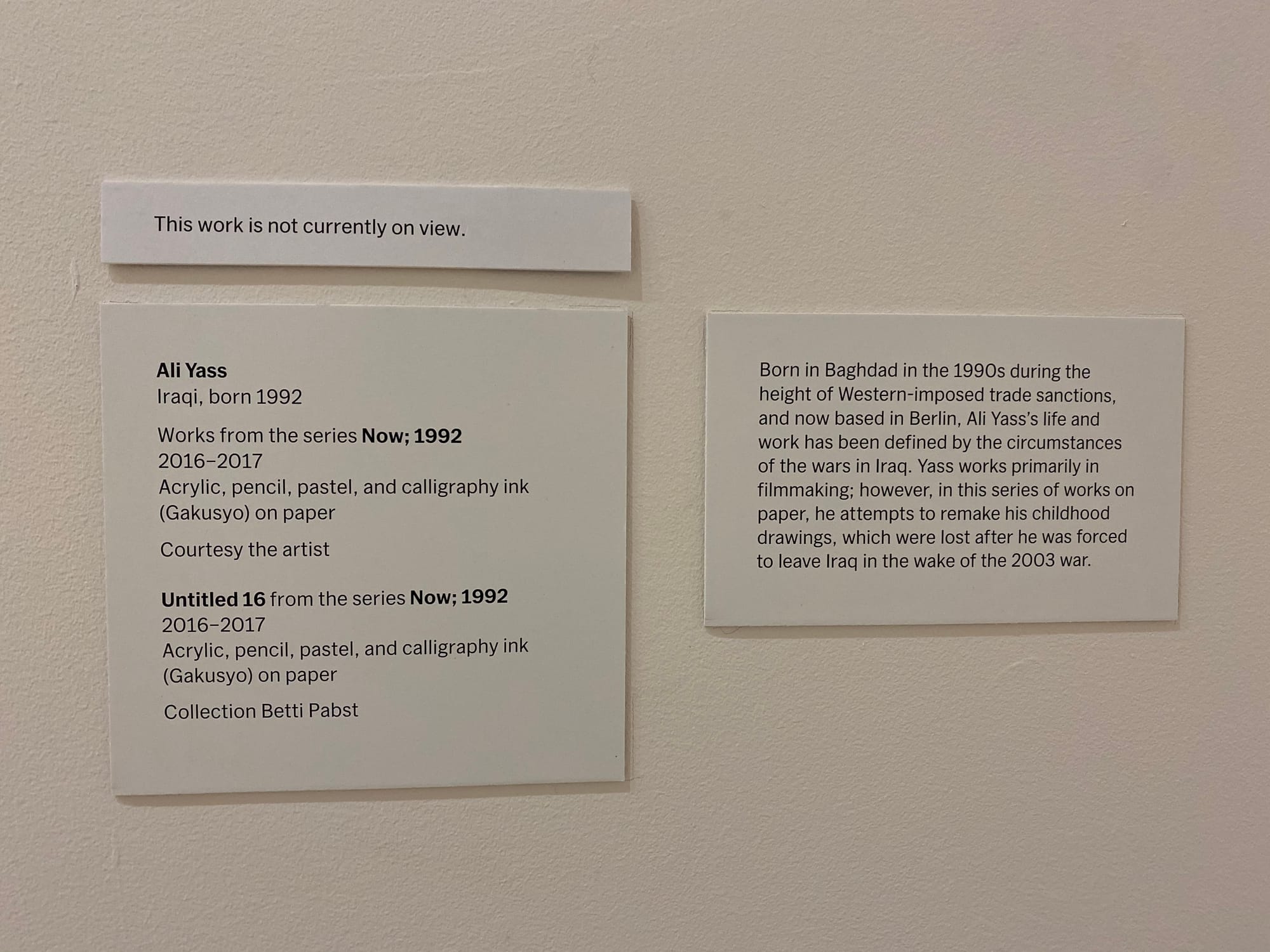 The protests continued to the museum’s third floor, where Yass’s work was previously installed. But before entering the exhibition space, they were stopped by security staffers who told them that the gallery was “closed to all visitors for security reasons.” This led to a back and forth of about 20 minutes between the protesters and the staffers, who were asked to explain the sudden decision. The gallery was open to the public up until the protest started, showing only the wall text for Yass’s removed work with an addition of a line that explained: “This work is not currently on view.”