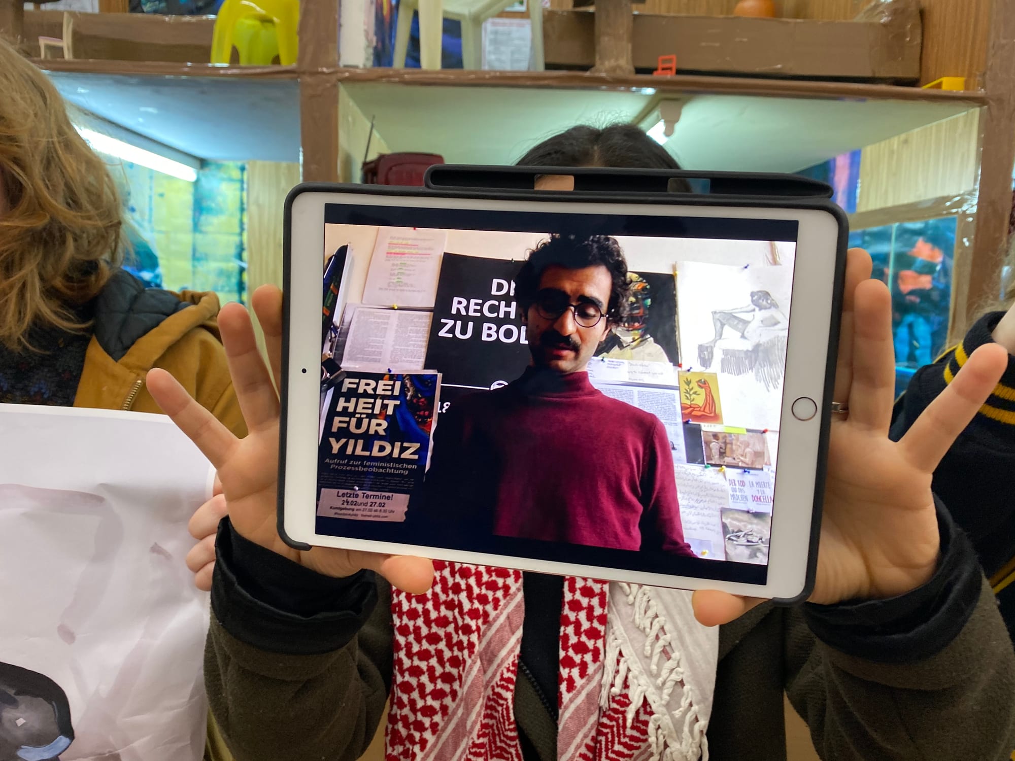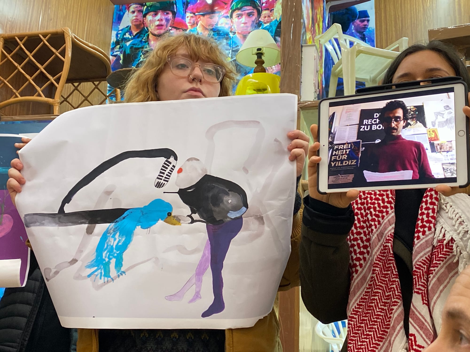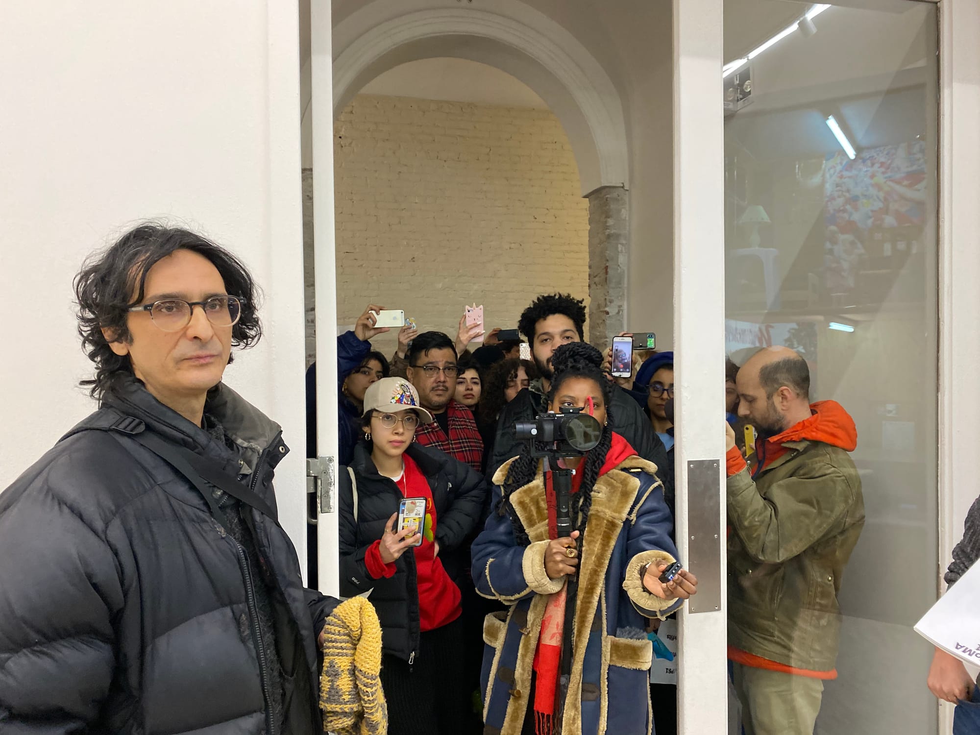 Yass was listening to this conversation from Berlin through a video call with one of the protesters. “The artist is right here, if you’re worried about his art,” the protester said and directed her phone at the security personnel.