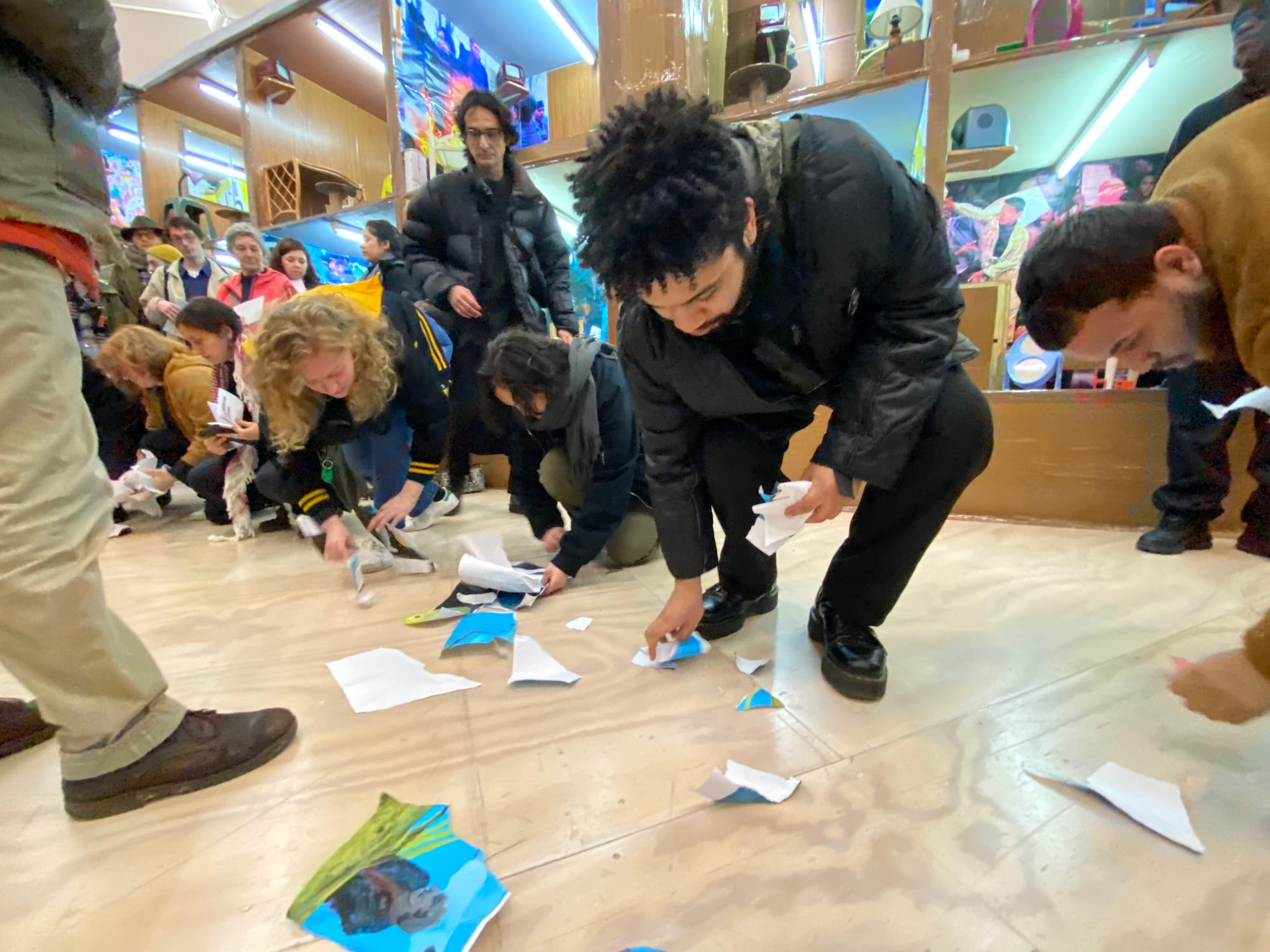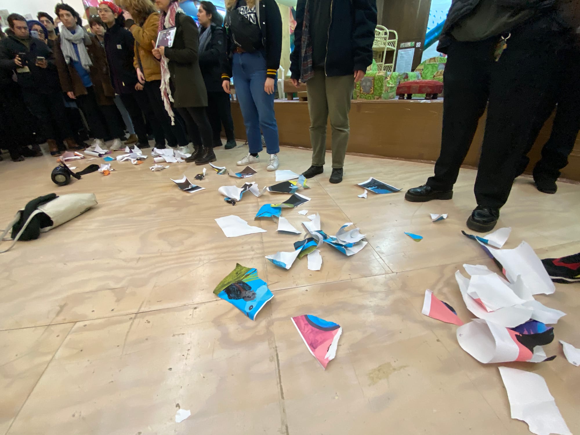 After Yass’s statement ended, the protesters collectively shredded replicas of his work. The action was followed by a few moments of tense silence, witnessed by Yass through the video call.