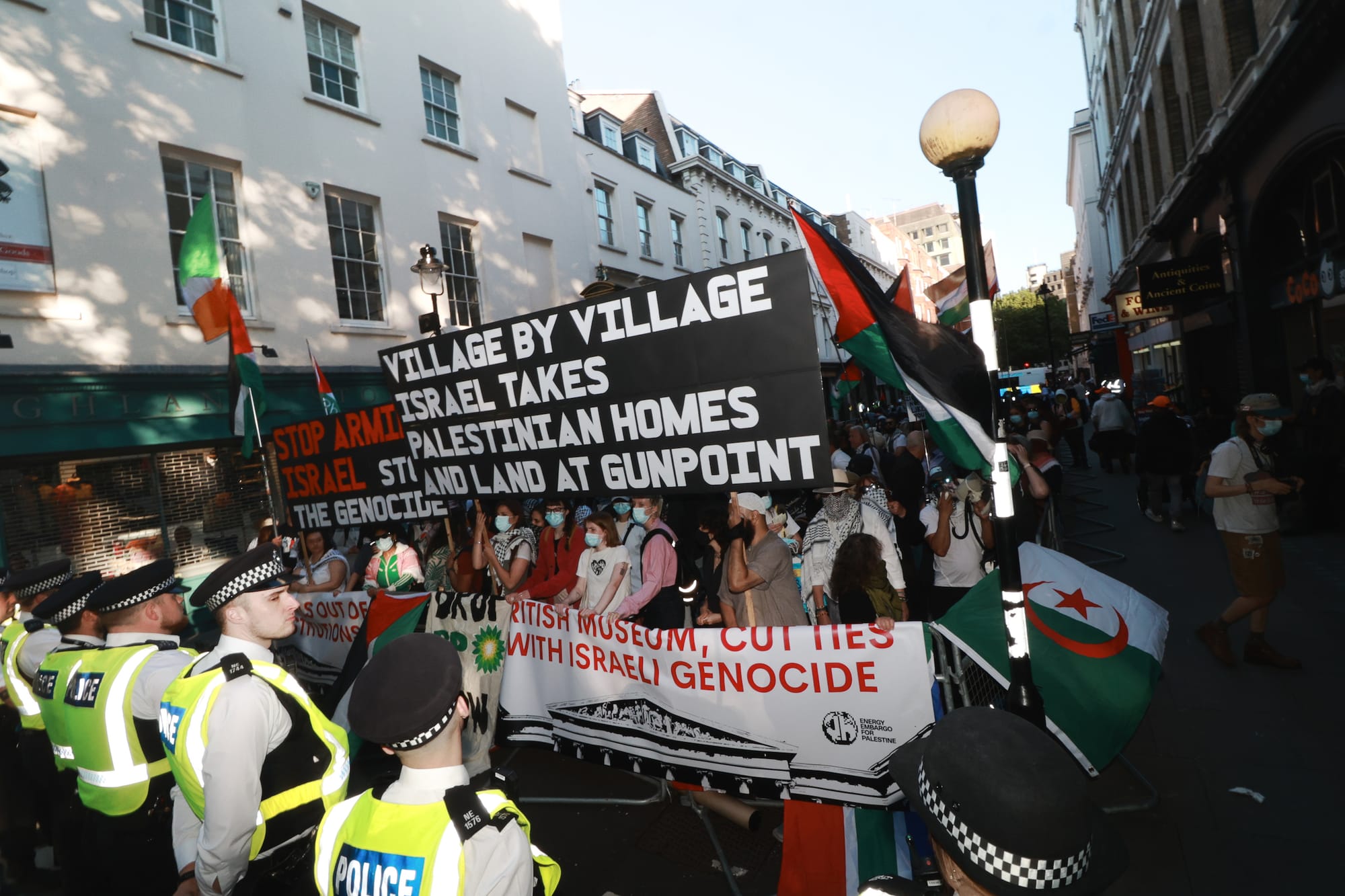 But outside, a heavily policed protest just beyond the museum’s front gates at the corner of Great Russell Street and Bury Place told a drastically different story. Behind rows of police barricades and neon-vested officers, activists wearing keffiyehs and holding black, red, white, and green signage decried the show of pomp for what Palestinians around the world have solemnly remembered since 1948 as the Nakba (Arabic for “the catastrophe”), when Israeli settlers permanently expelled 750,000 Palestinians from their homelands.