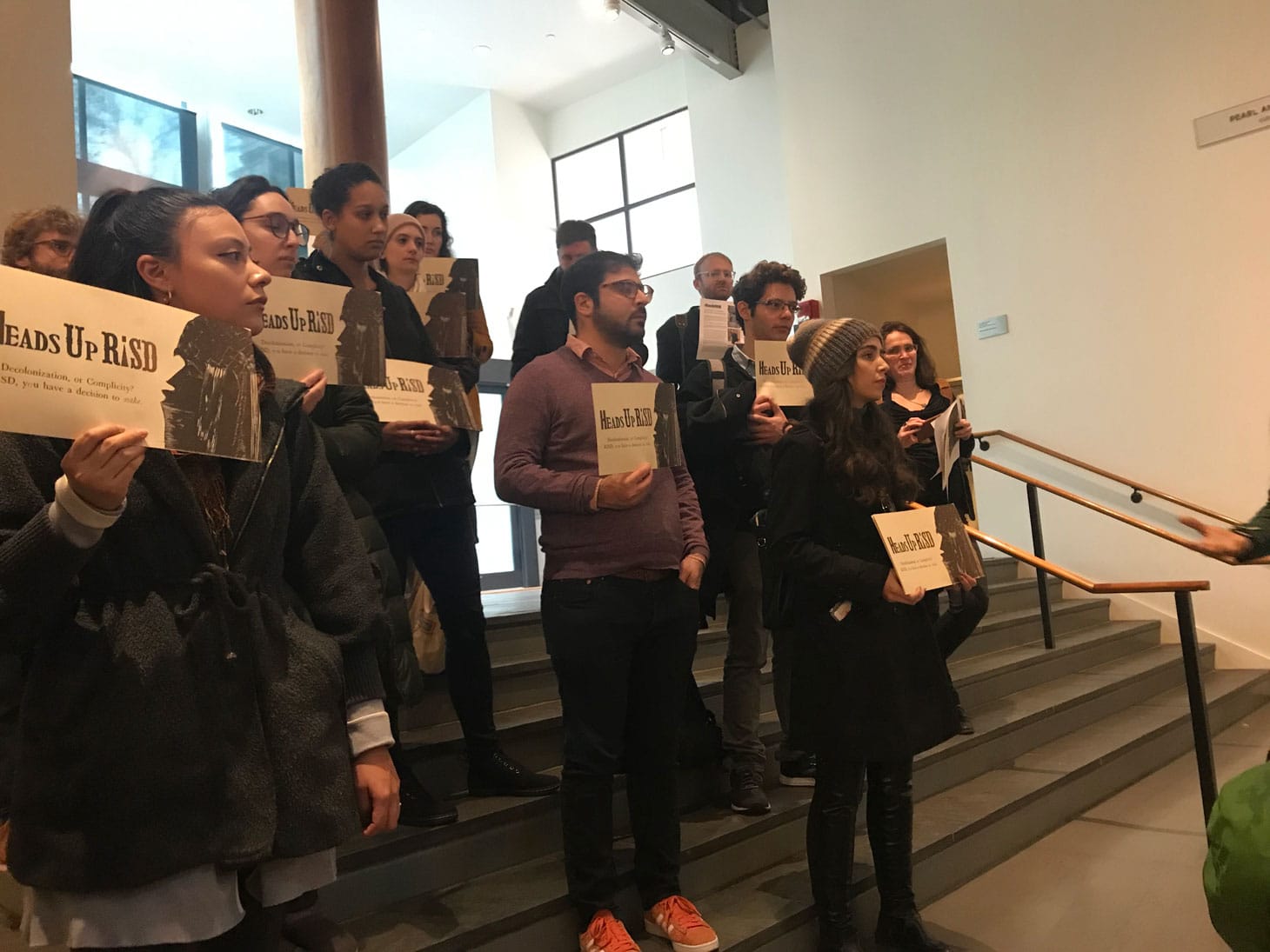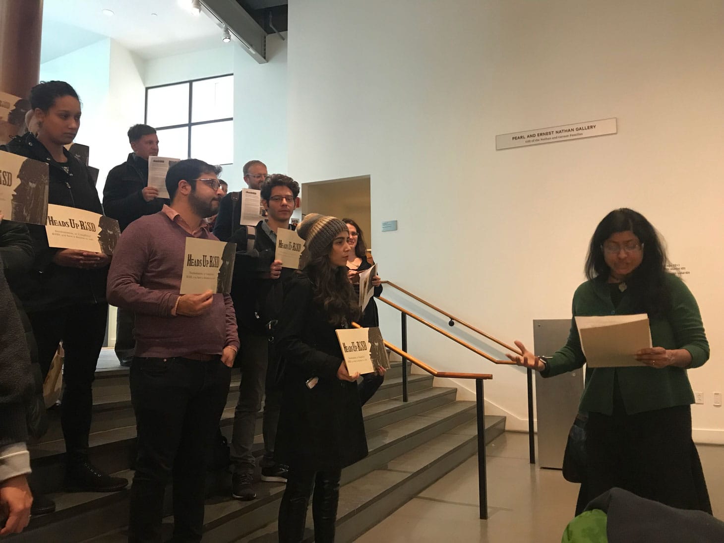 Individuals in the group took turns reading aloud their collective message. They make it clear that they “are not acting as the messenger of existing restitution claims,” and that they are acting “in solidarity with the communities who claim [restitution] by calling for a decolonial approach that goes to the root of the museum’s institutional culture.” Repeating the individual speakers before them, the group demands the museum to willingly “embrace new modes of accountability” and that “RISD respect[s] and respond[s] to these claims with no delay.” A list of demands was also announced. They can be found online.