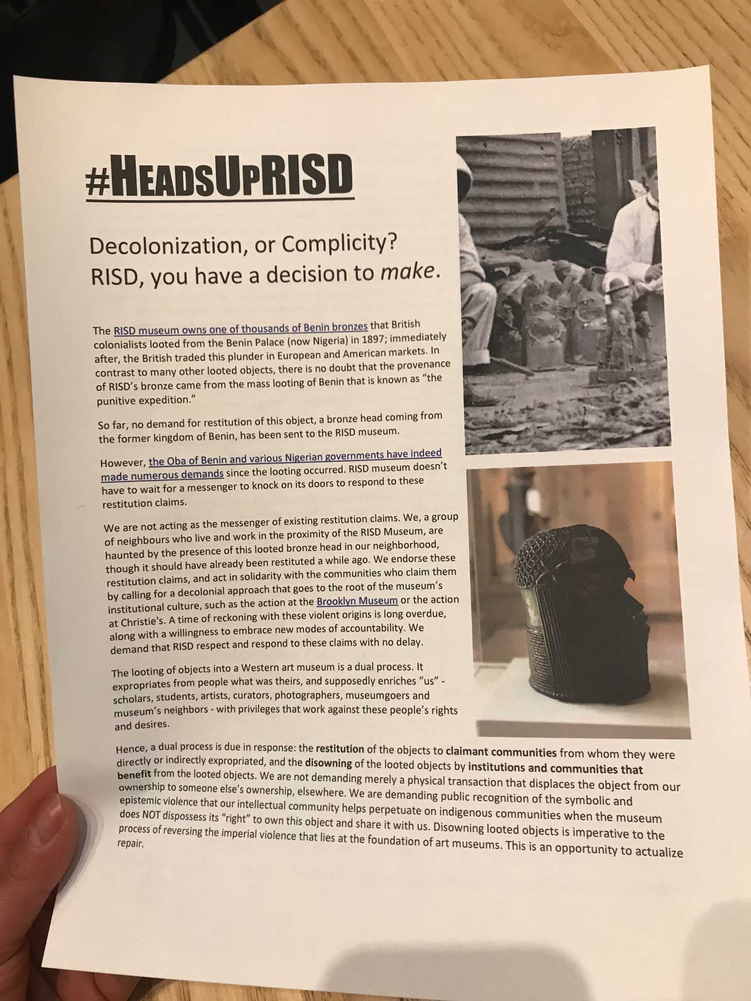 The group flooded the front entrance of the museum and announced their call to action, leading with the chant, “Heads up, RISD!” Demonstrators distributed letterpress posters which read, “Heads Up RISD. Decolonization, or Complicity? RISD, you have a decision to make.” The poster also featured an image of the main object in question at today’s demonstration: a bronze sculpture from the Kingdom of Benin.