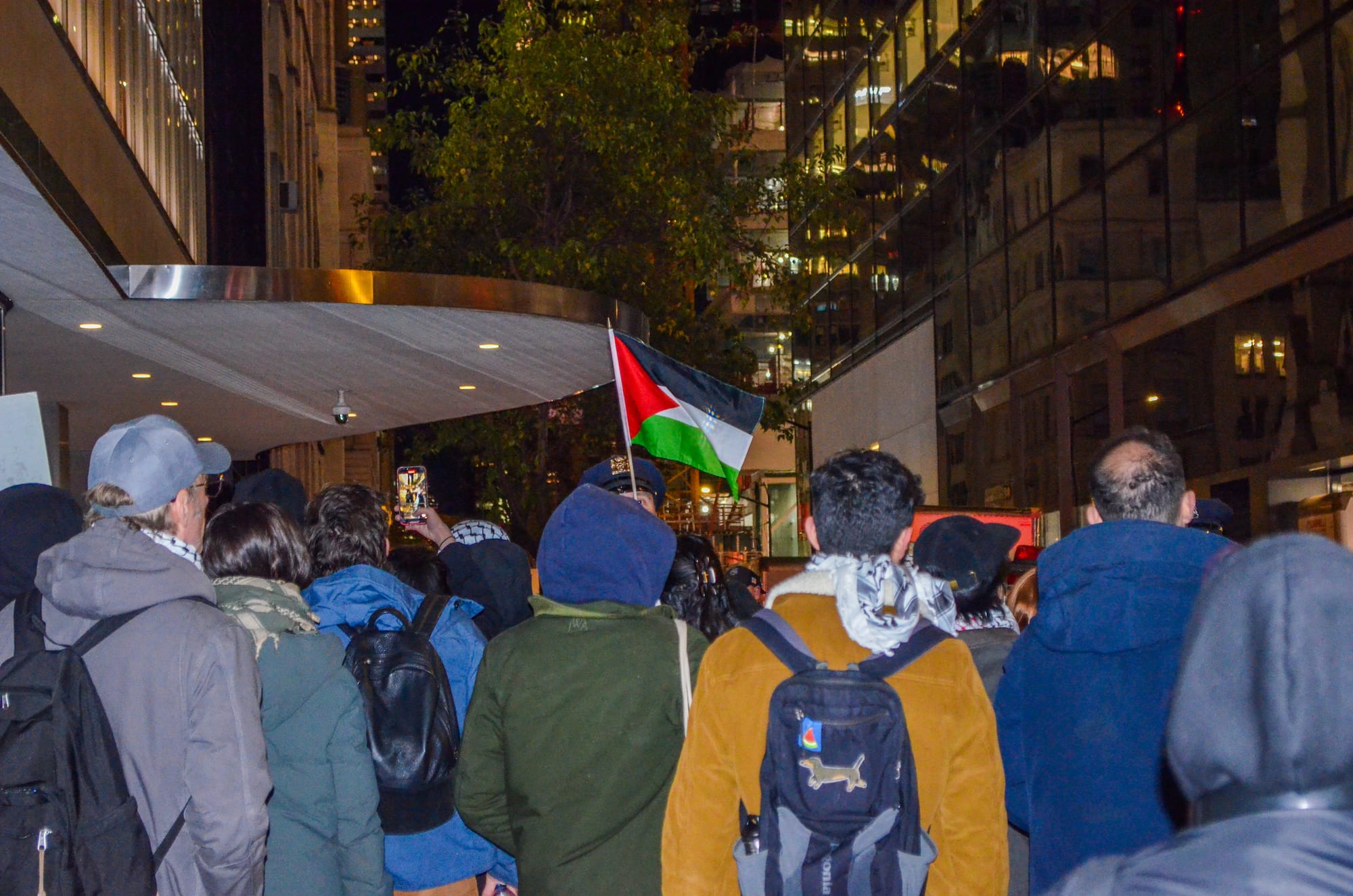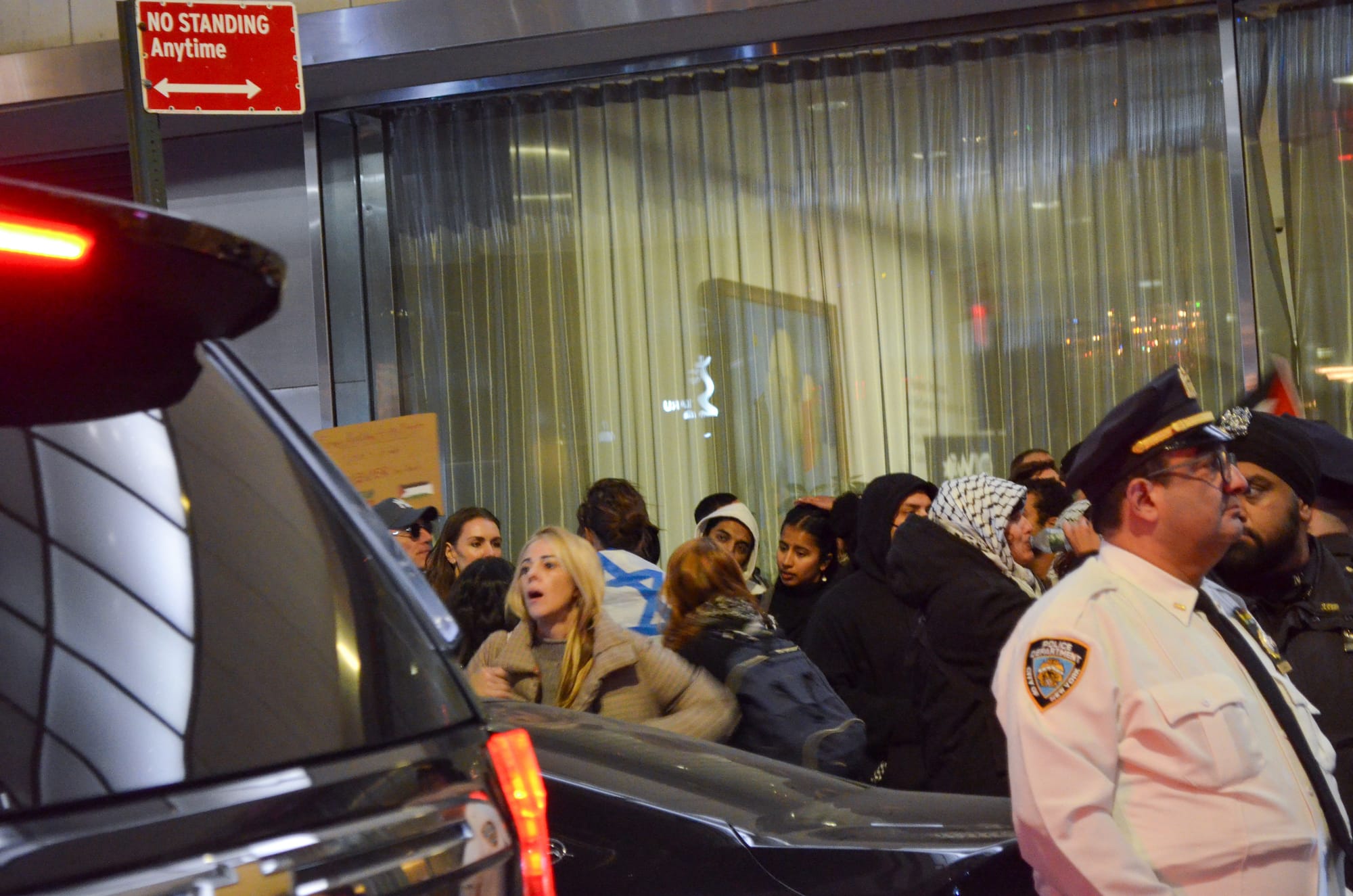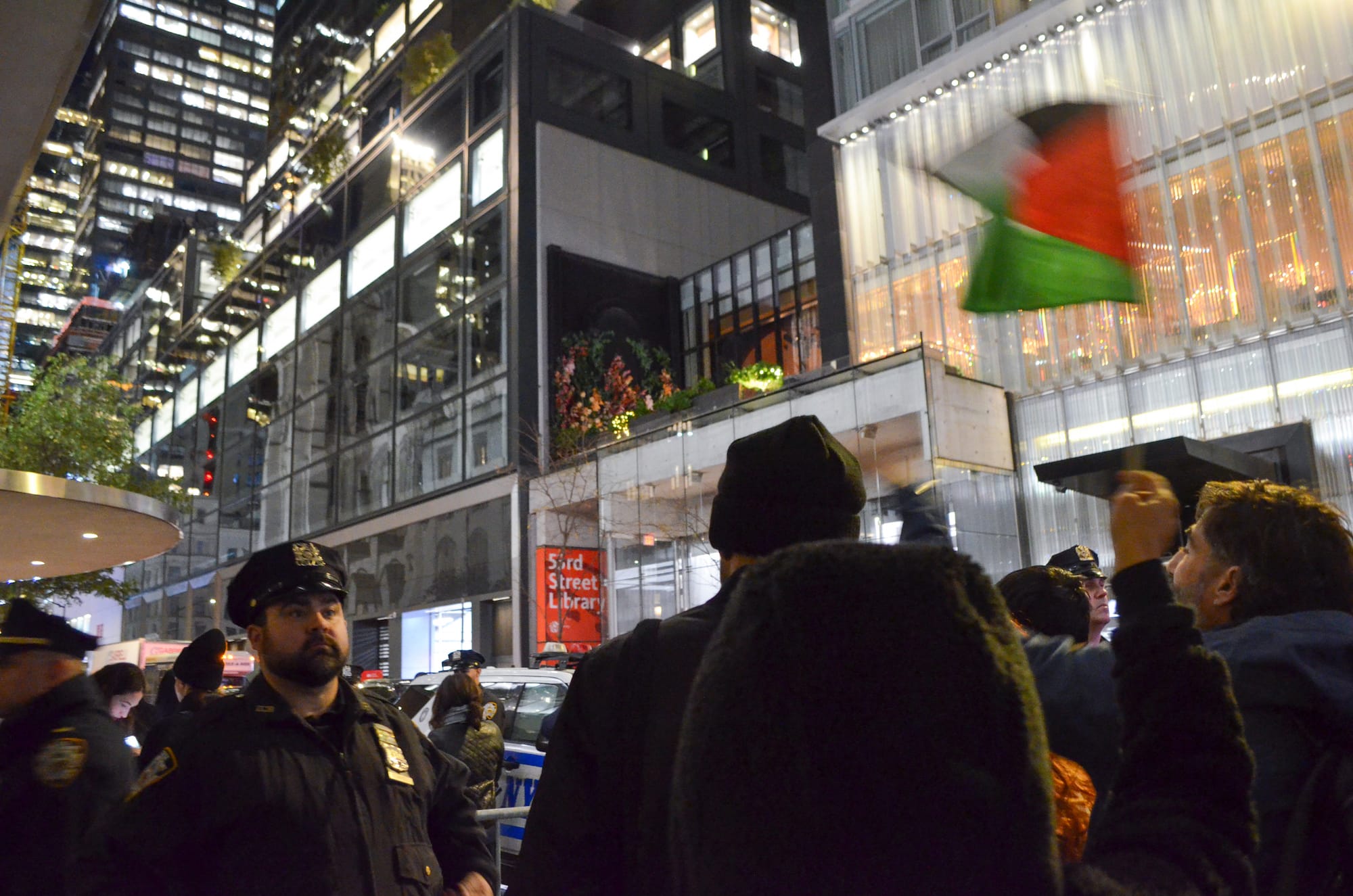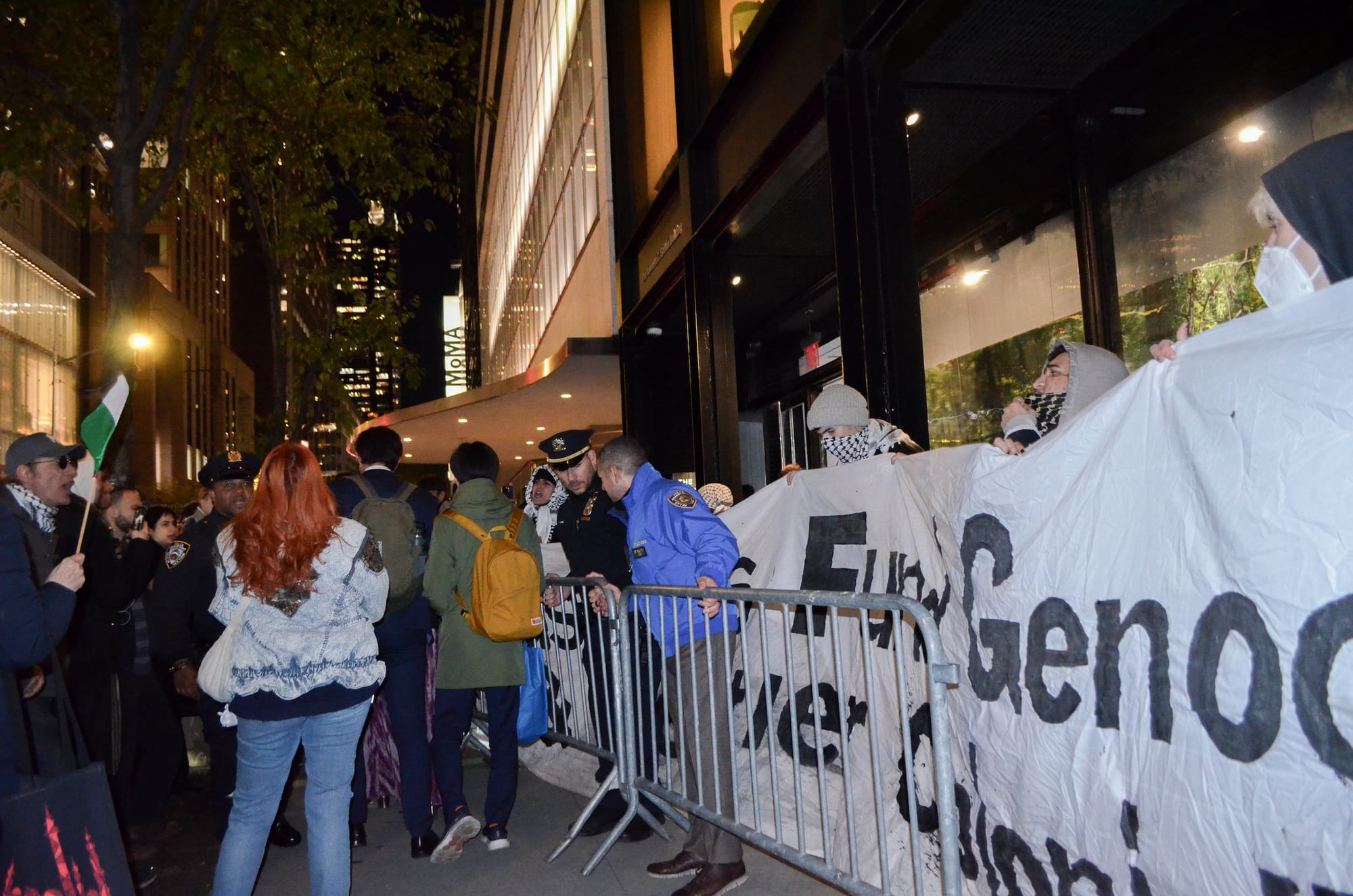 A woman wearing an Israeli flag draped around her shoulders made her way into the group of protesters around 6:30pm and was escorted out of the crowd by police seconds later without the flag. Hyperallergic also witnessed an altercation between a suited man and a protester wearing a keffiyeh; the protester, who declined to provide his name, alleged that the man yanked at the Palestinian headscarf on his neck. A police officer then ushered the suited man inside MoMA.