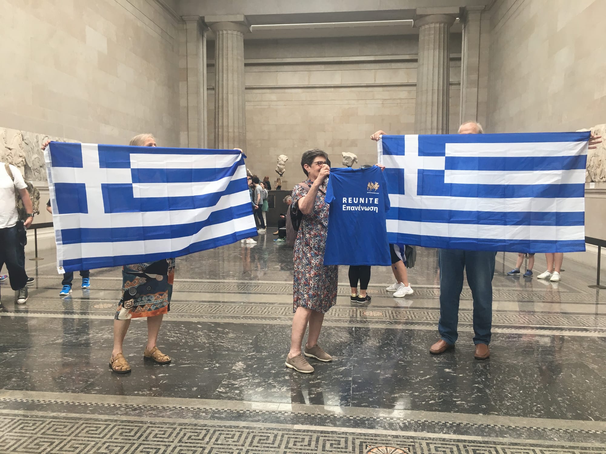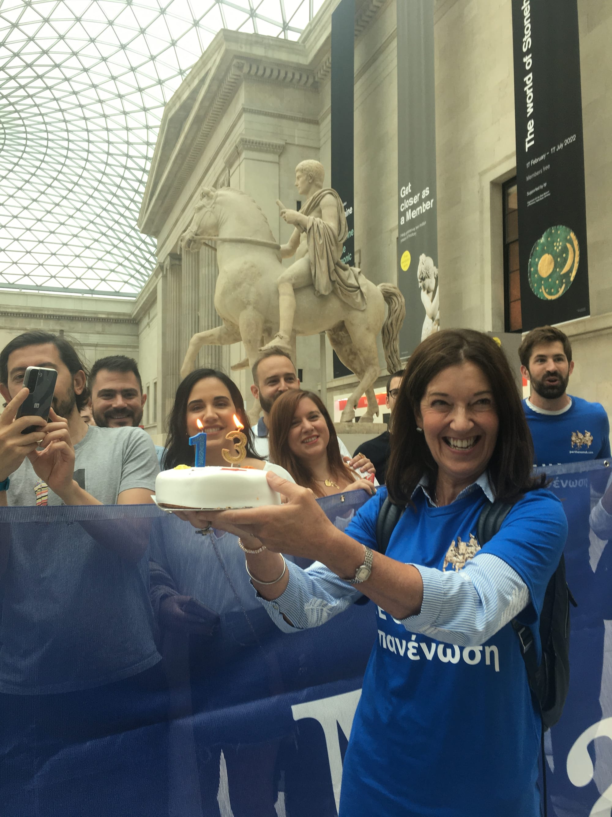 This weekend’s protest at the British Museum was organized by the British Committee for the Reunification of the Parthenon Marbles (BCRPM). The group was founded in 1983, the same year that the Greek government made its first official request for the permanent return of the sculptures in the British Museum’s collection. Protesters gathered outside the museum at 2pm before moving inside to the Great Court, waving Greek flags and holding a large banner with the slogan “Reunify the Marbles.” Members of the Greek and British communities made impassioned speeches calling for the return of the Parthenon Marbles and sang “Happy Birthday” to the Acropolis Museum.